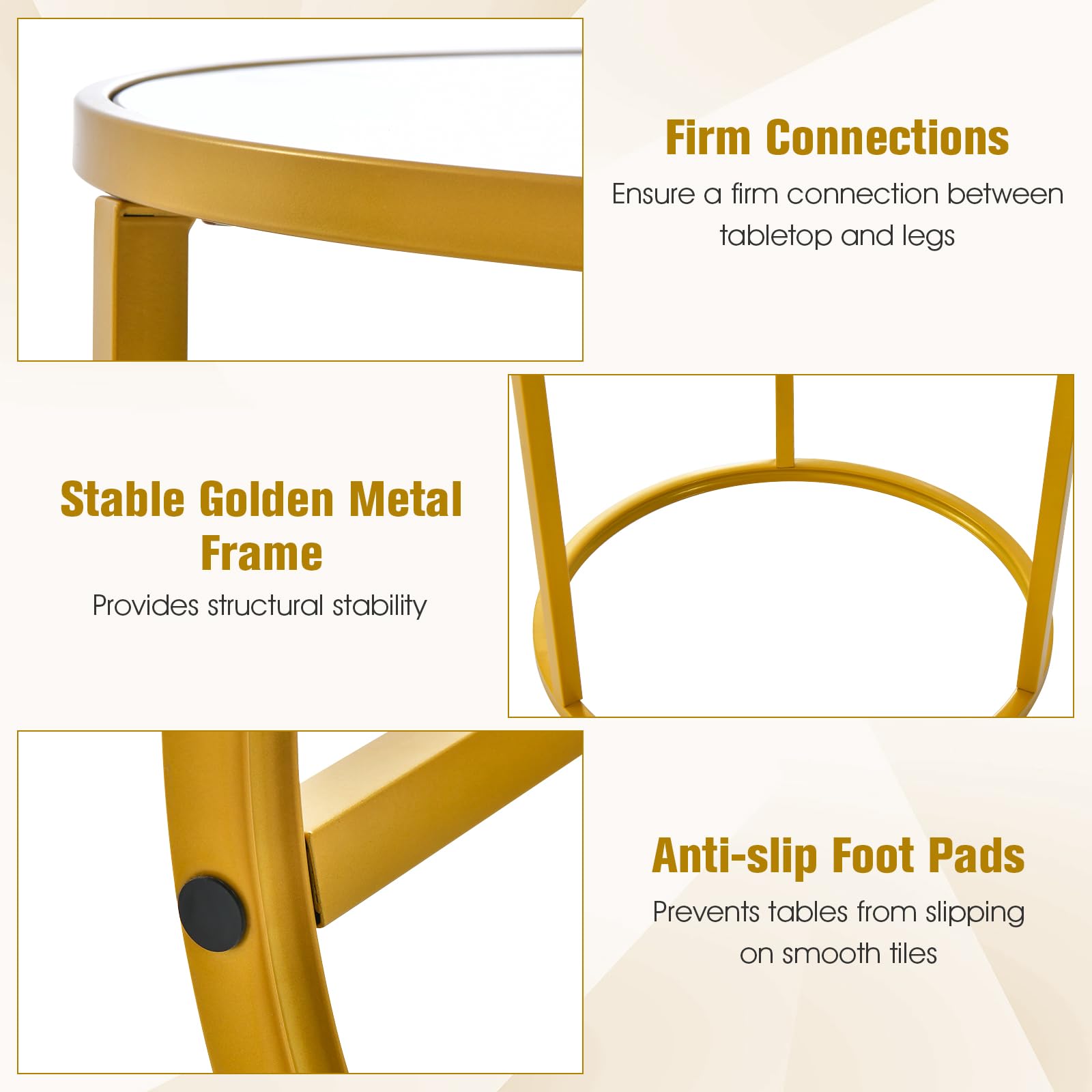 - Crafted with a solid all-metal frame, our gold accent table has a reliable structure. The powder coating ensures the metal parts are resistant to rust. More, it also comes equipped with non-slip feet for extra stability.