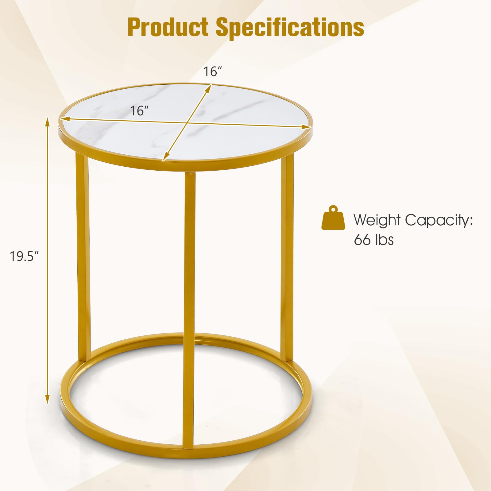 - This gold marble end table boasts a lightweight and versatile design, making them effortlessly portable. Their ideal size and perfect height make them a convenient addition to your living room, bedroom, girls' room, porch, office, hotel, or any small space. Whether placed next to a sofa, chair, or bed, this gold accent table add a touch of style wherever you need it.