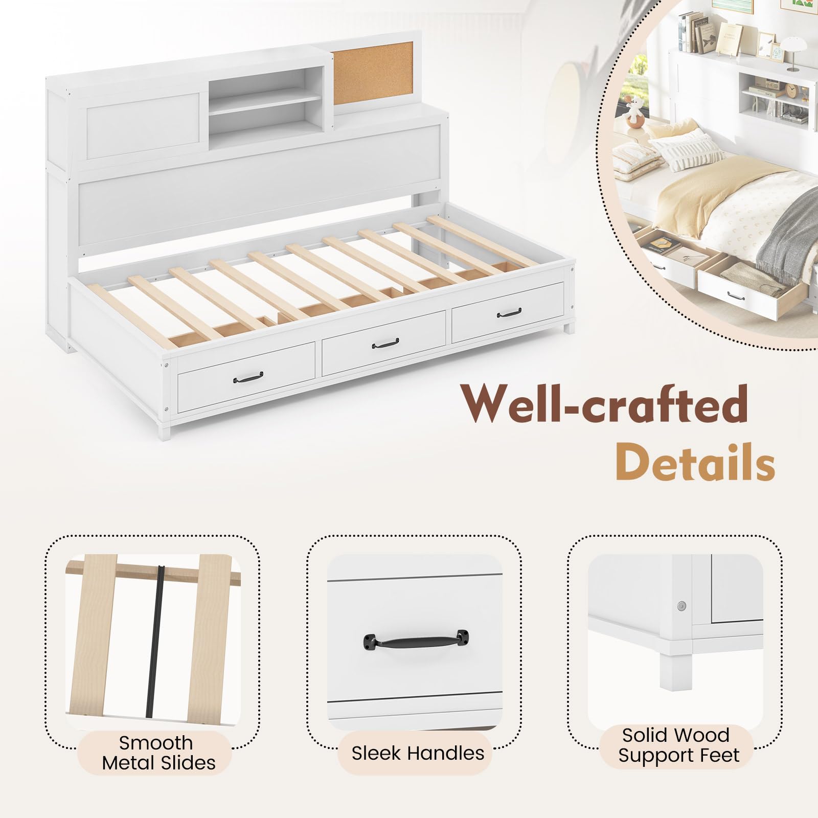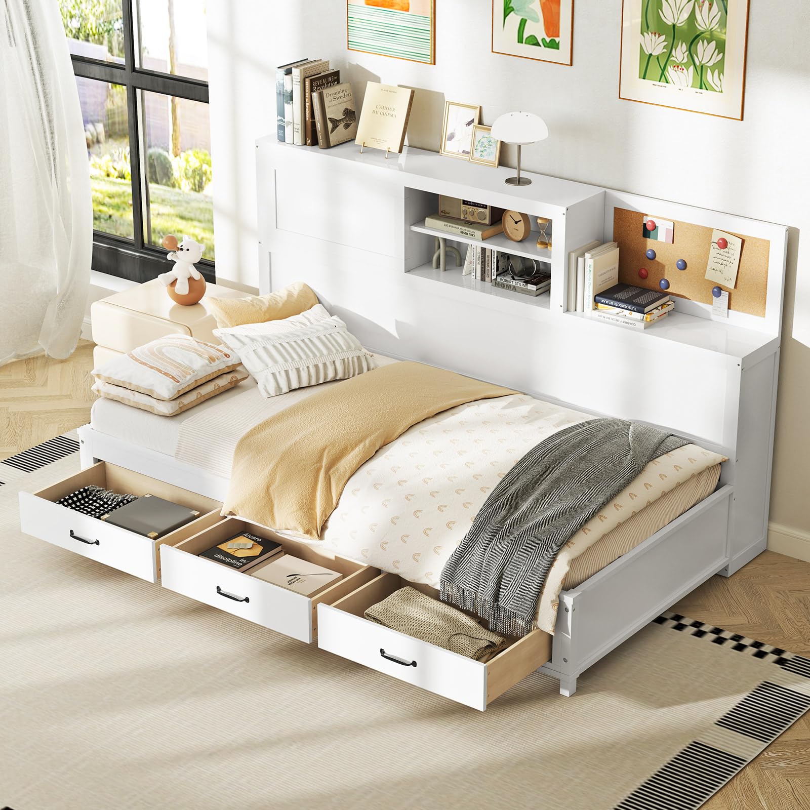 Storage, Wooden Day Bed with 3 Storage Drawers, Shelves, Cork Board & Sliding Door,