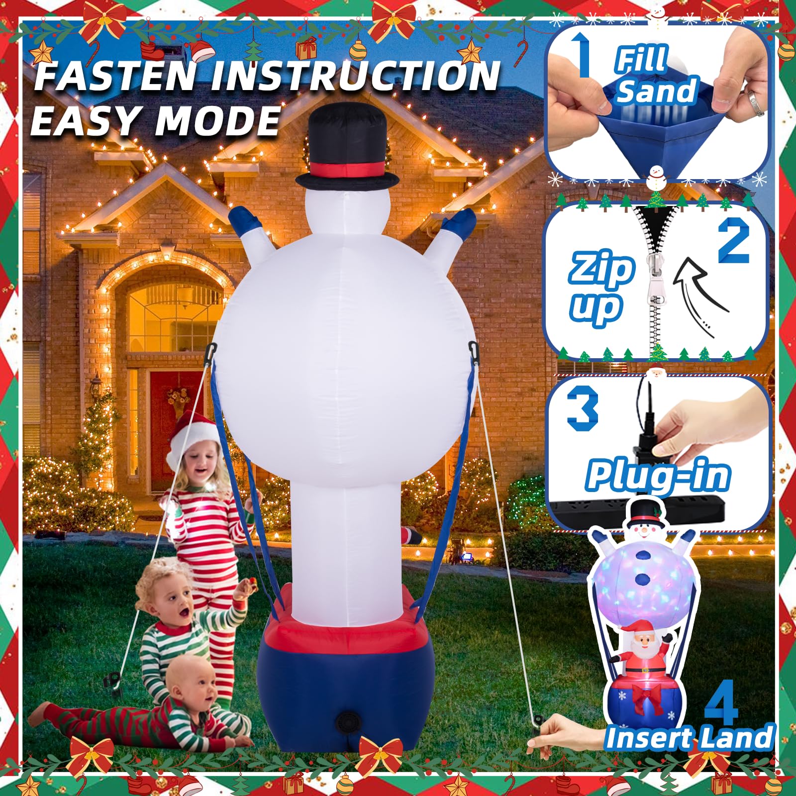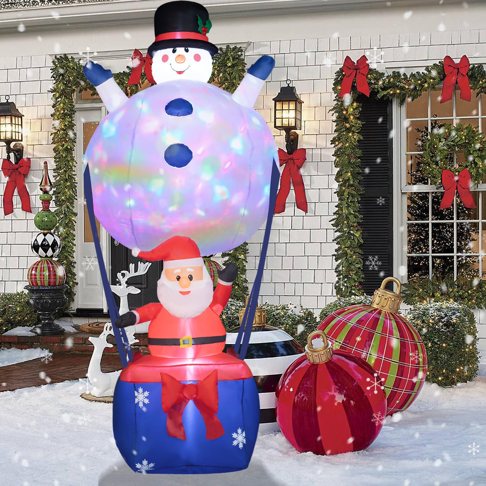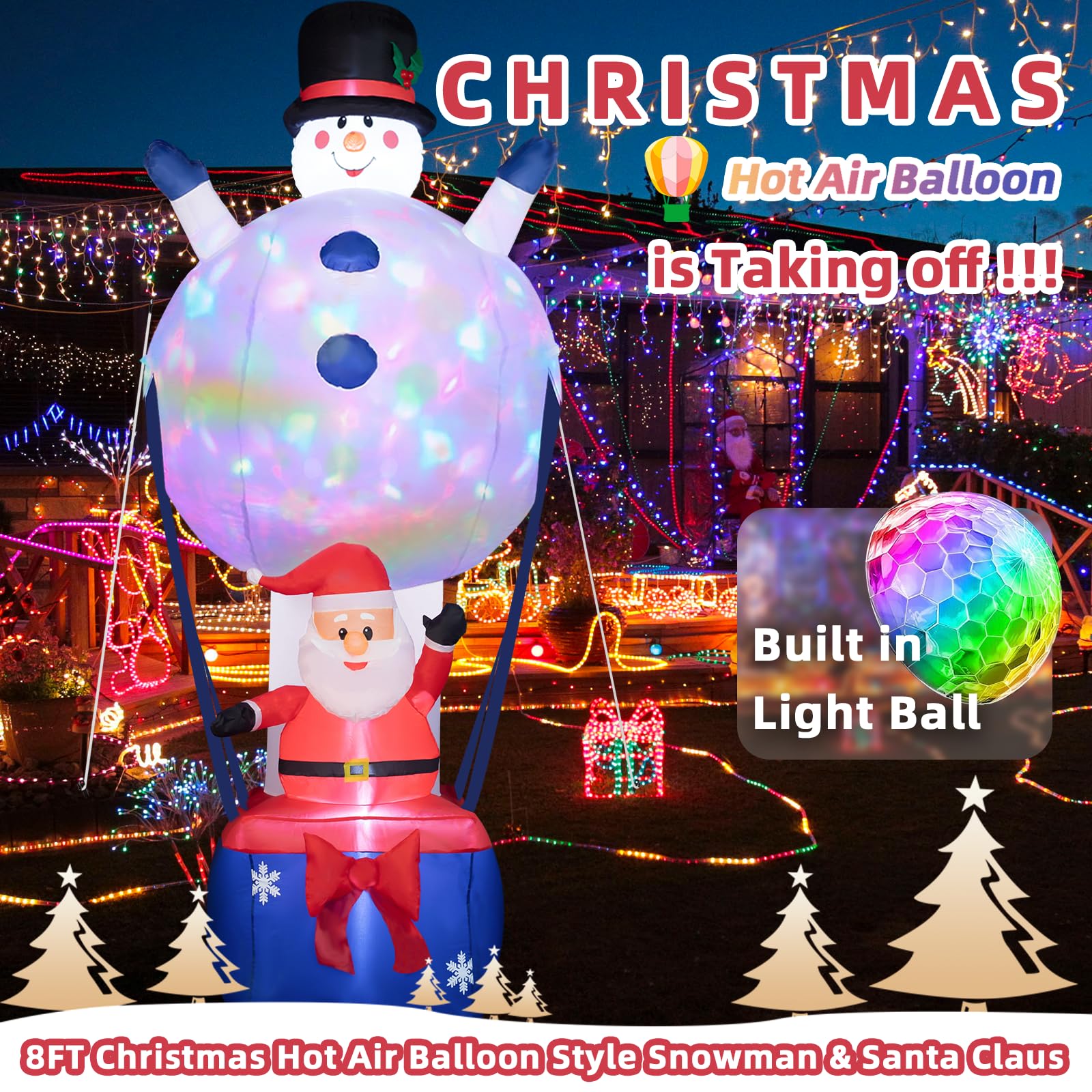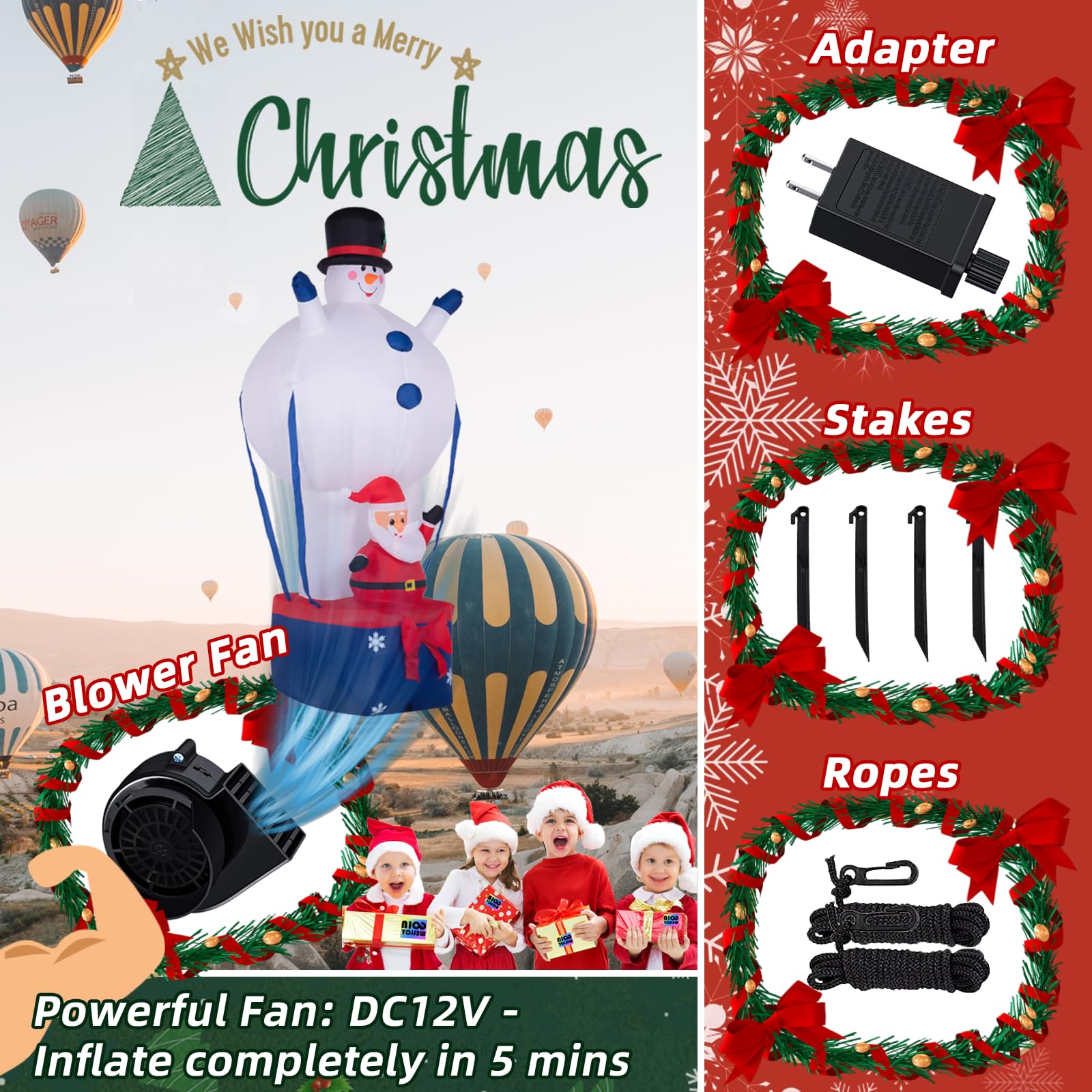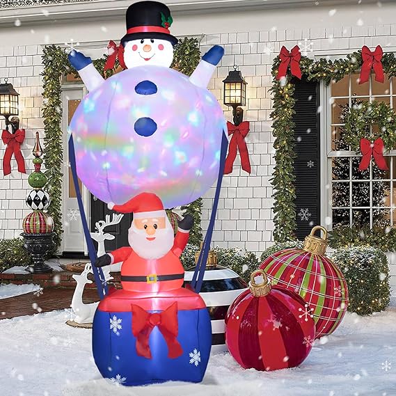 - Aerial Celebration: Christmas inflatables with unique fire balloon-style designs featuring iconic characters, a jubilant Snowman, and Santa Claus, ready for their Christmas voyage.