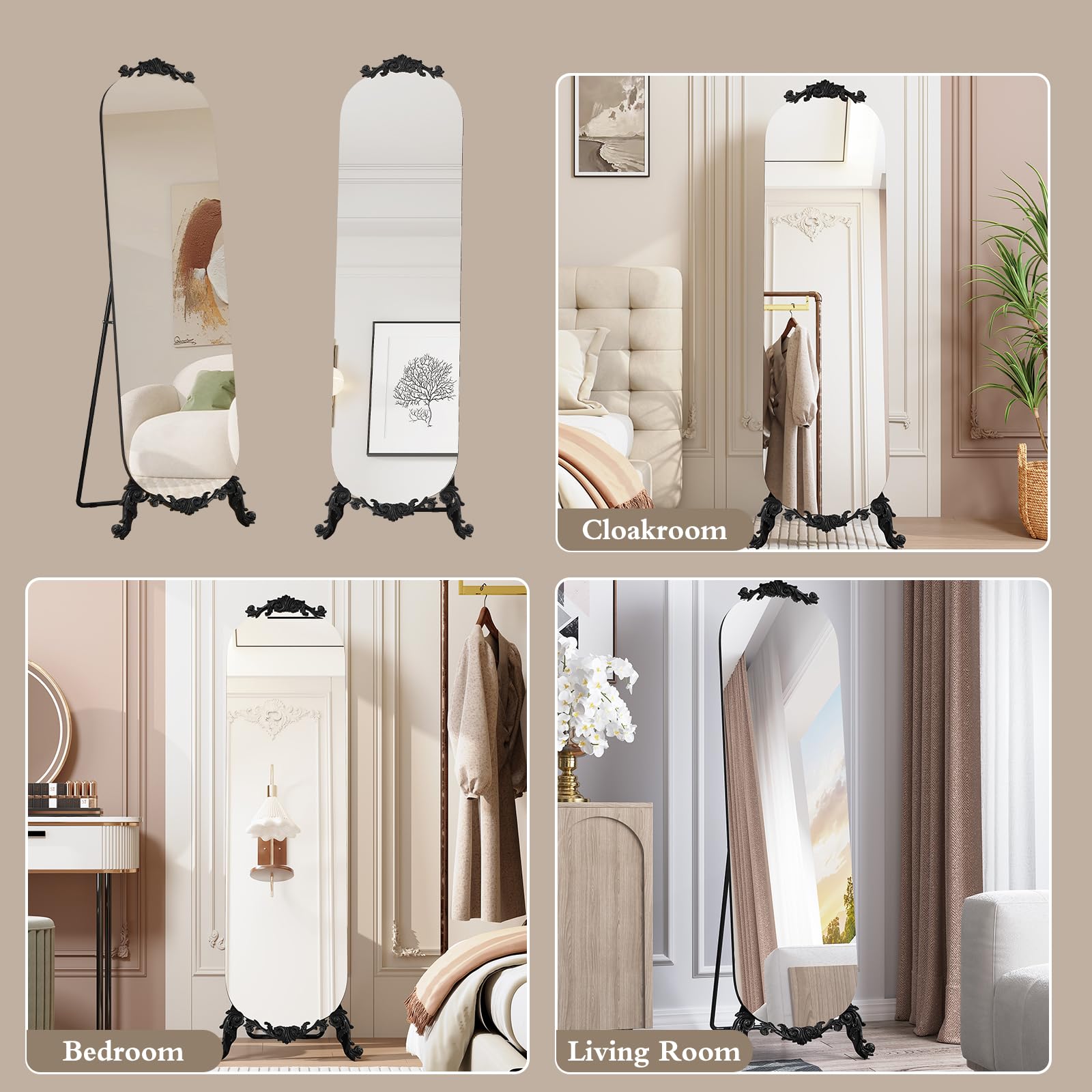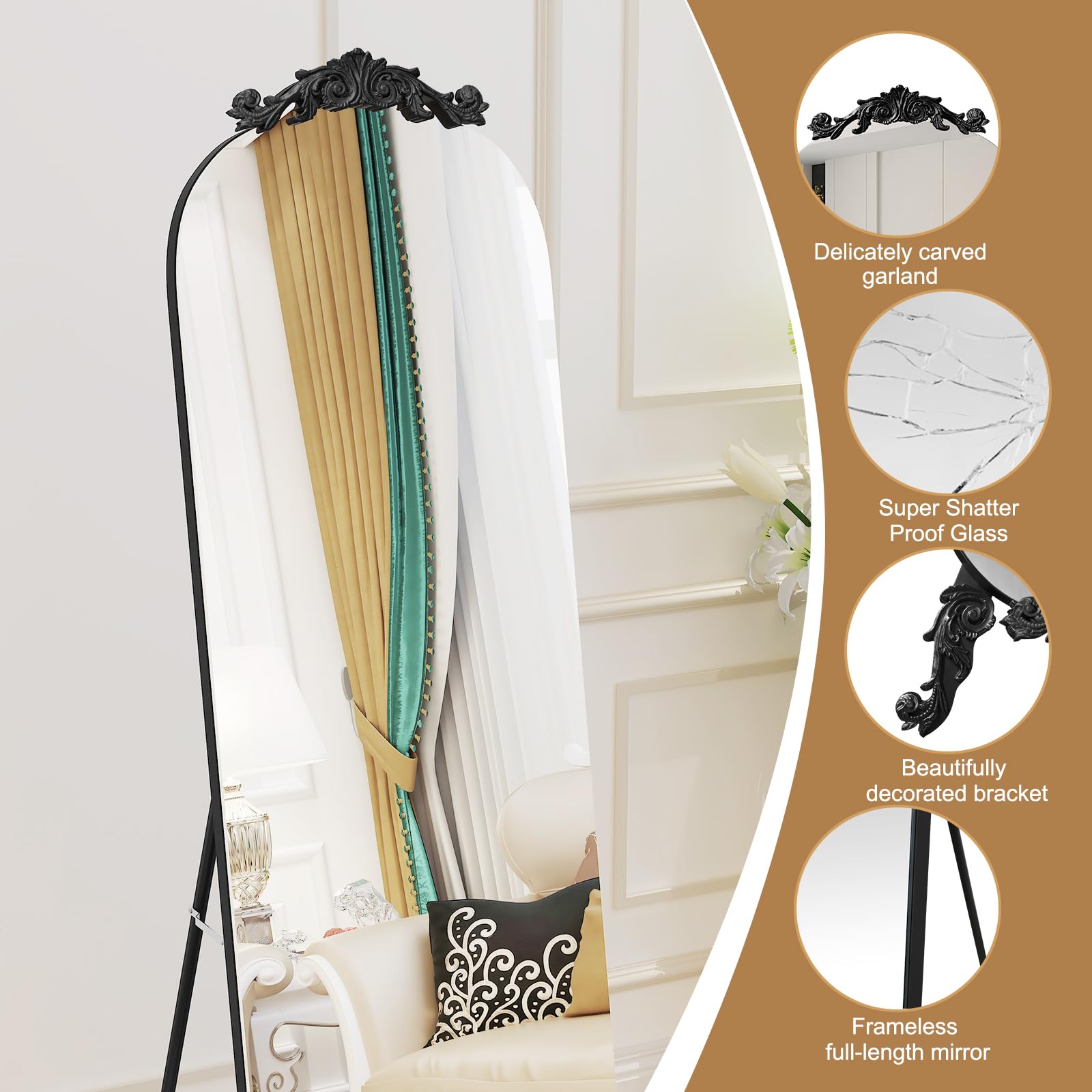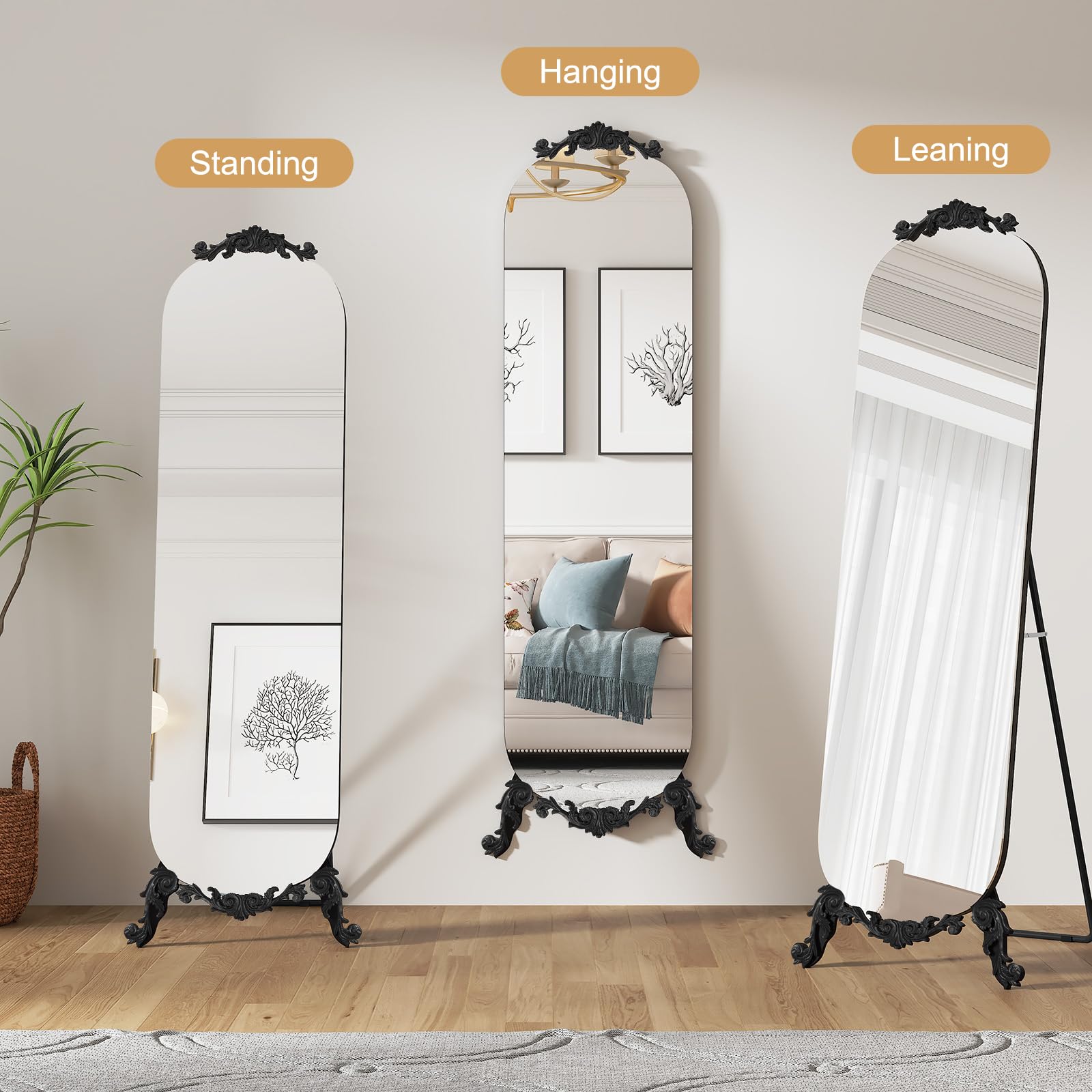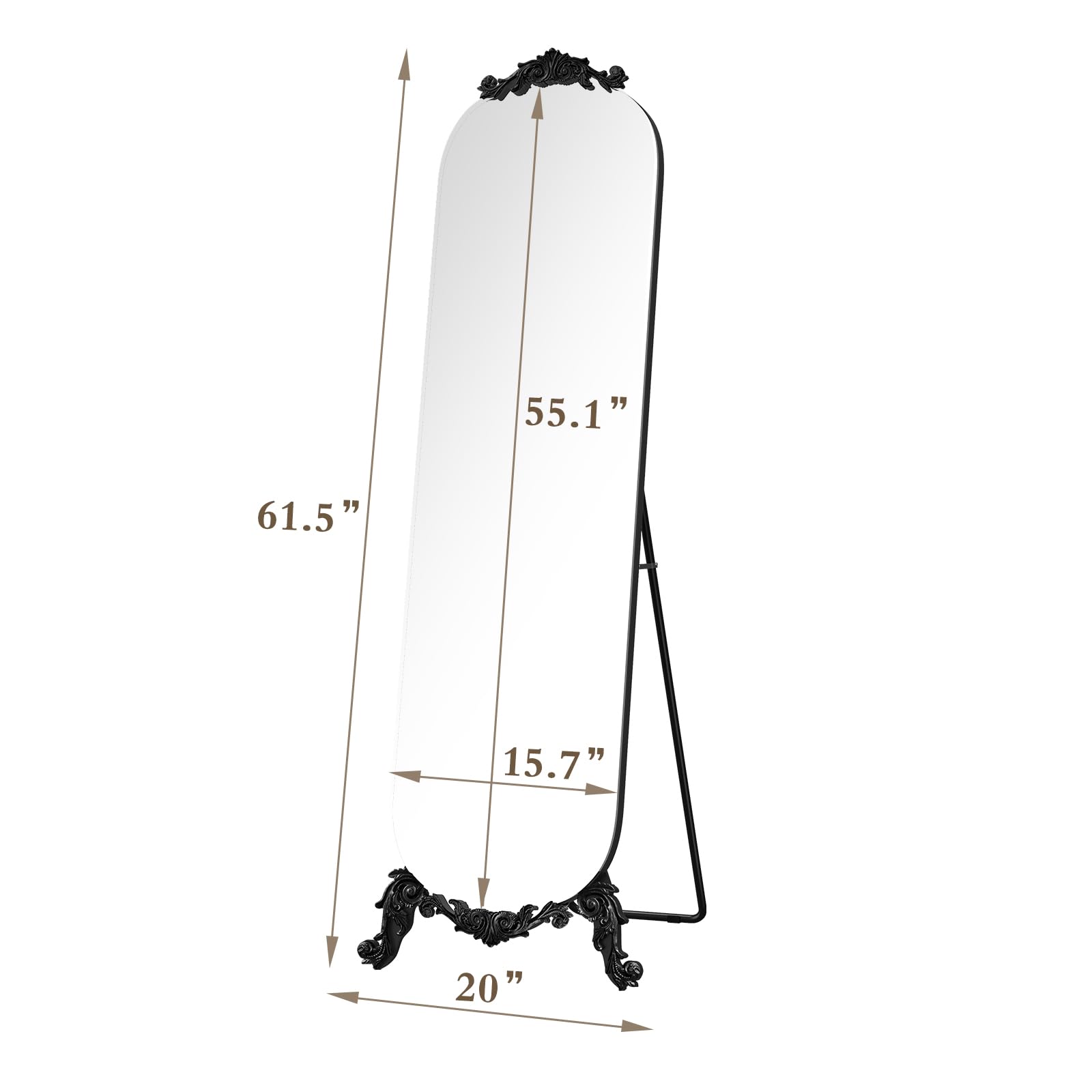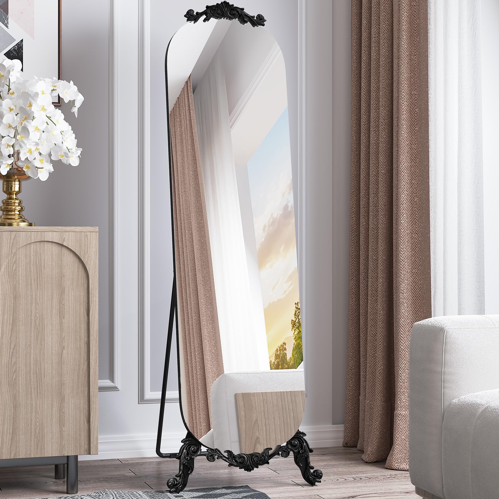 This decorative floor mirror features a sophisticated arched silhouette with intricate carved details that evoke timeless Gothic elegance. The generous 61.5-inch height provides a complete head-to-toe reflection, while the sleek black finish adds a modern touch to the vintage-inspired design. Whether positioned in your bedroom for daily use or displayed in your entryway to create a grand first impression, this mirror enhances both function and aesthetics.