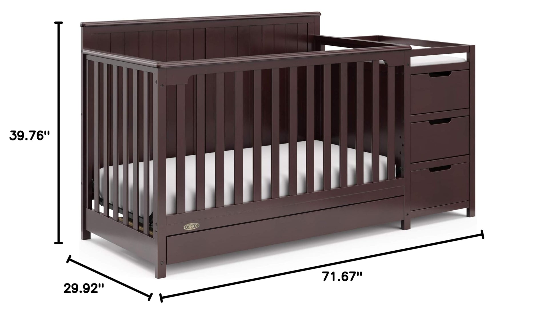 Details: The Graco Hadley 4-in-1 Convertible Crib and Changer with Drawer was designed with safety, innovation, and convenience in mind. Available in White, Espresso, and Pebble Gray baby-safe, non-toxic finishes, the Hadley features a spacious drawer for easy storage of nursery essentials, and converts from crib to toddler bed, day bed, and full-size bed to grow with your baby throughout life’s multiple stages. Like all Graco cribs, the Hadley is expert tested to meet or exceed all applicable federal safety standards to ensure the safest sleeping environment for your child. The Graco Hadley 4-in-1 Convertible Crib and Changer with Drawer features an attached changing table, complete with a water-resistant baby changing pad with safety strap, as well as 3 drawers and 2 open shelves. This all-in-one crib is backed by a 1-year limited manufacturer's warranty. To complete your Graco crib, we recommend pairing it with the award-winning Graco Premium Foam Crib and Toddler Bed Mattress. Easy assembly required. Mattress not included. Crib conversion kit sold separately.