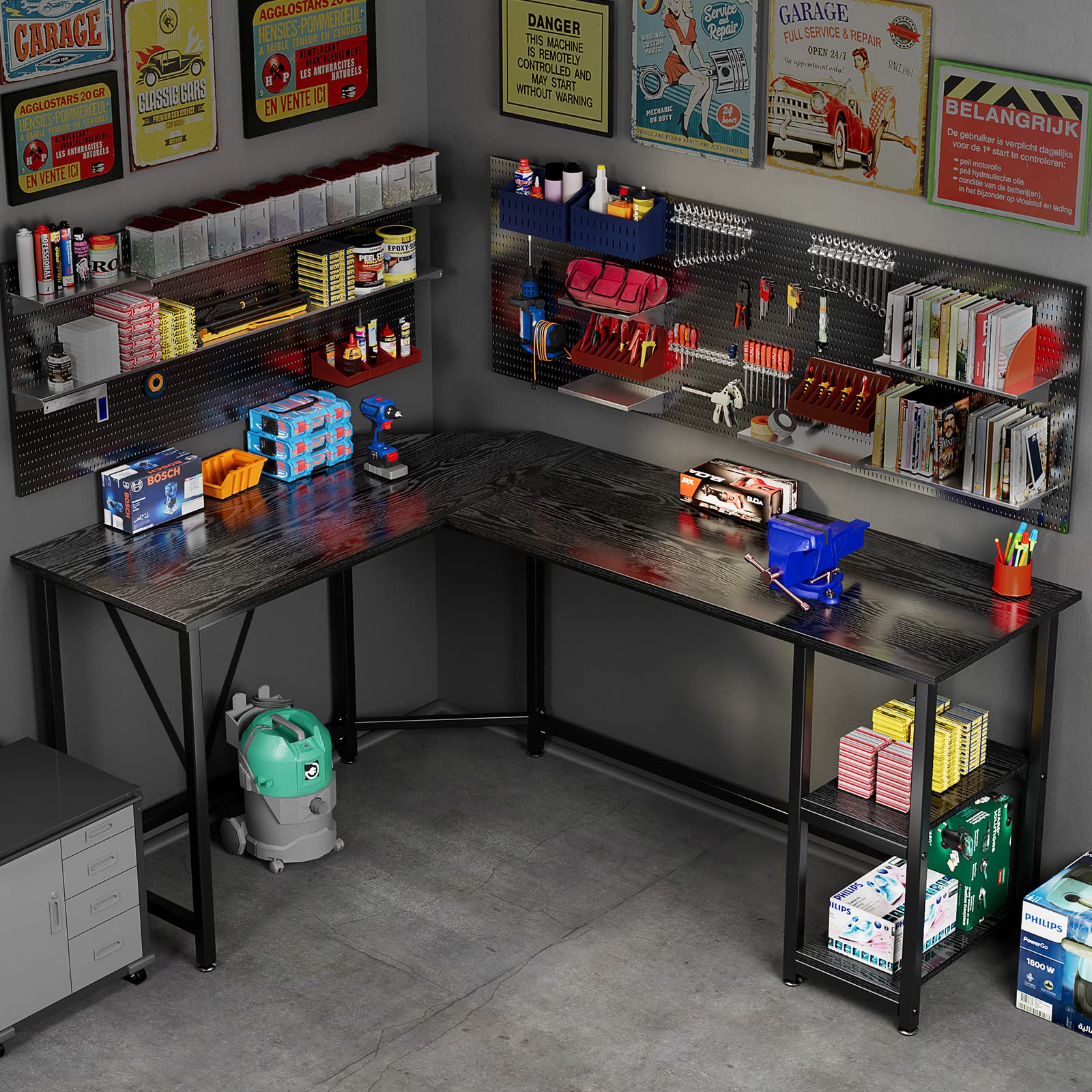 - L SHAPED DESK WITH ADJUSTABLE STORAGE SHELVES: L desk with two-tier storage shelves gives you extra storage space. The height of storage open shelves can be adjustable,so it is conveniently customize your space by changing the height of the middle shelf. Adjustable storage shelve maximally utilizes your home office space and provide ample space for storing books,files,devices and hosts.