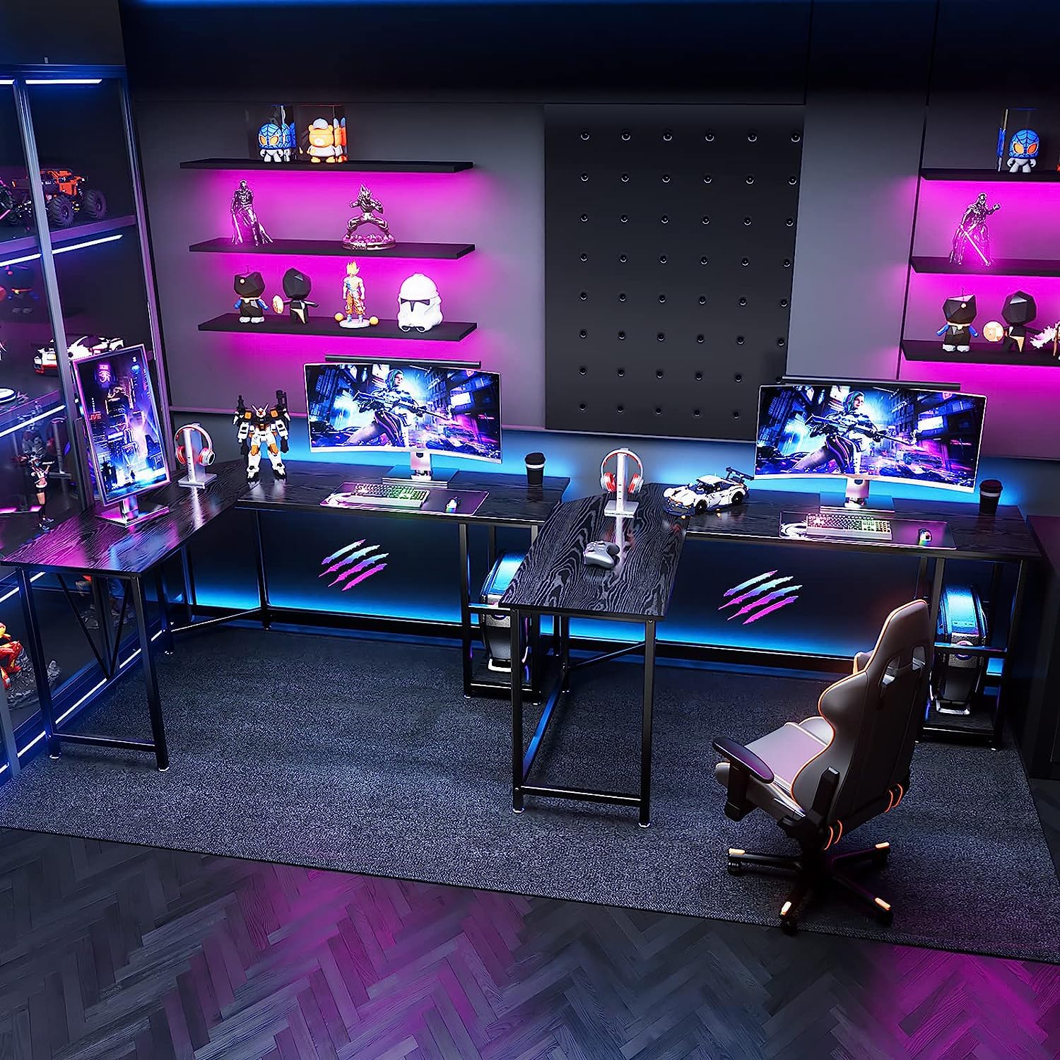 - STURDY CONSTRUCTION GAMING DESK:This corner desk is made from waterproof and anti-scratch particle board and metal frame.Thick metal frames and extra V shaped metal brackets ensure stability,which can hold up to 300 lbs.The adjustable non-slip foot pad not only protect your floor from being scratched, but also ensure stability on uneven ground.