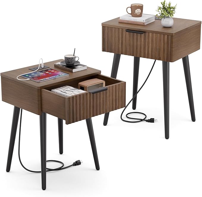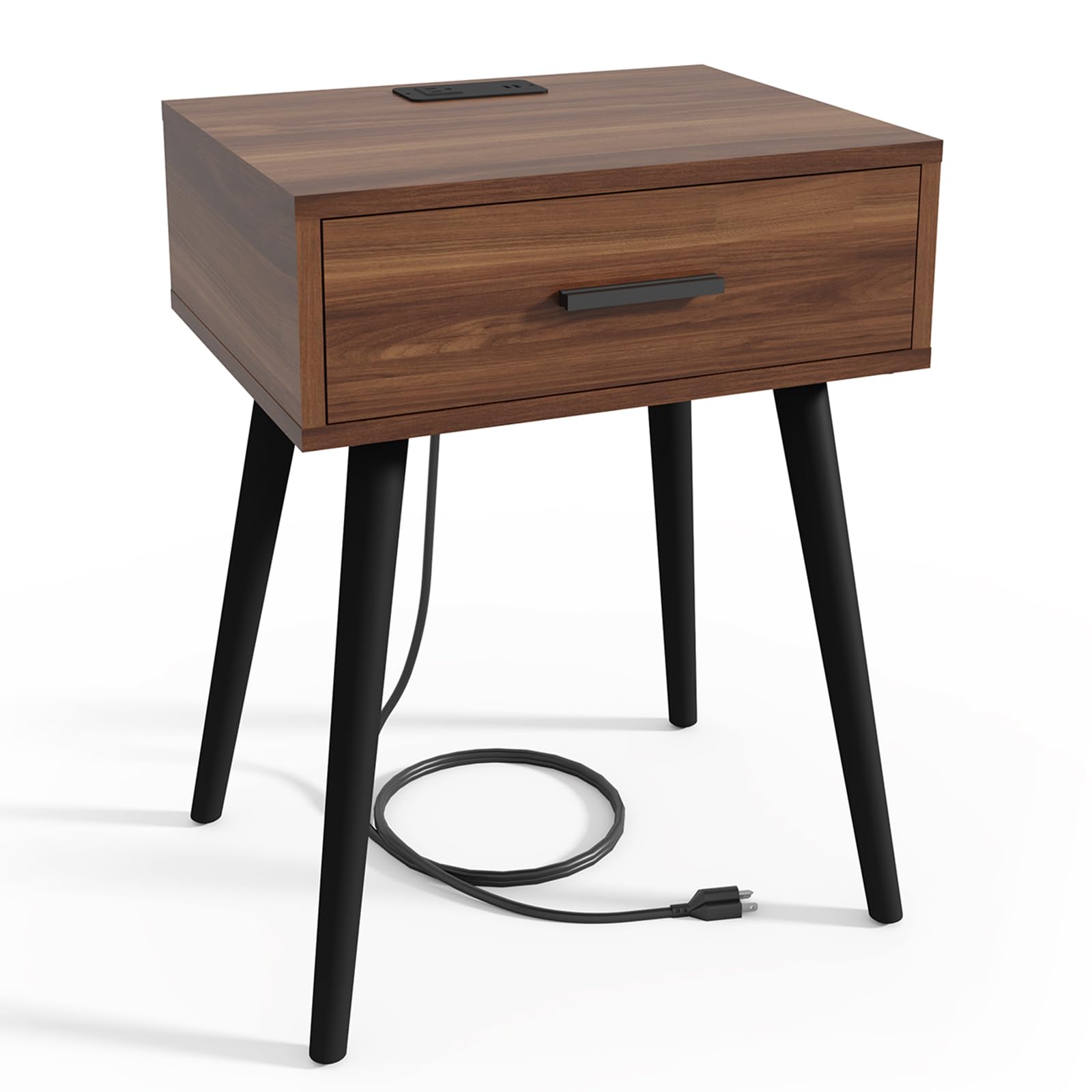 Mid Century End Table with Charging Station, Modern One Drawer Nightstand Side Table