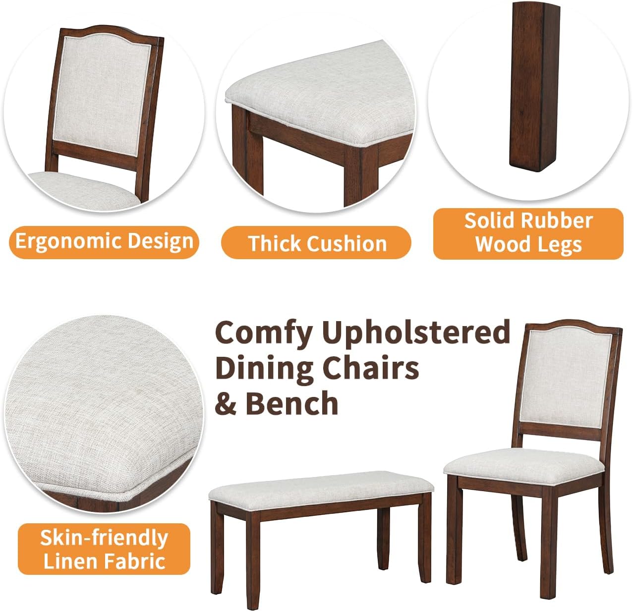 - [QUALITY MATERIAL] - The dining table and chairs set is made of sturdy solid wood frame for durability. The dining chairs and benches come with comfortable seat cushions filled with soft foam and made of linen for a cozy dining experience. The dining table with acacia legs can hold up to 350 pounds, and the rubberwood upholstered dining chairs and benches can hold up to 250 pounds each.
