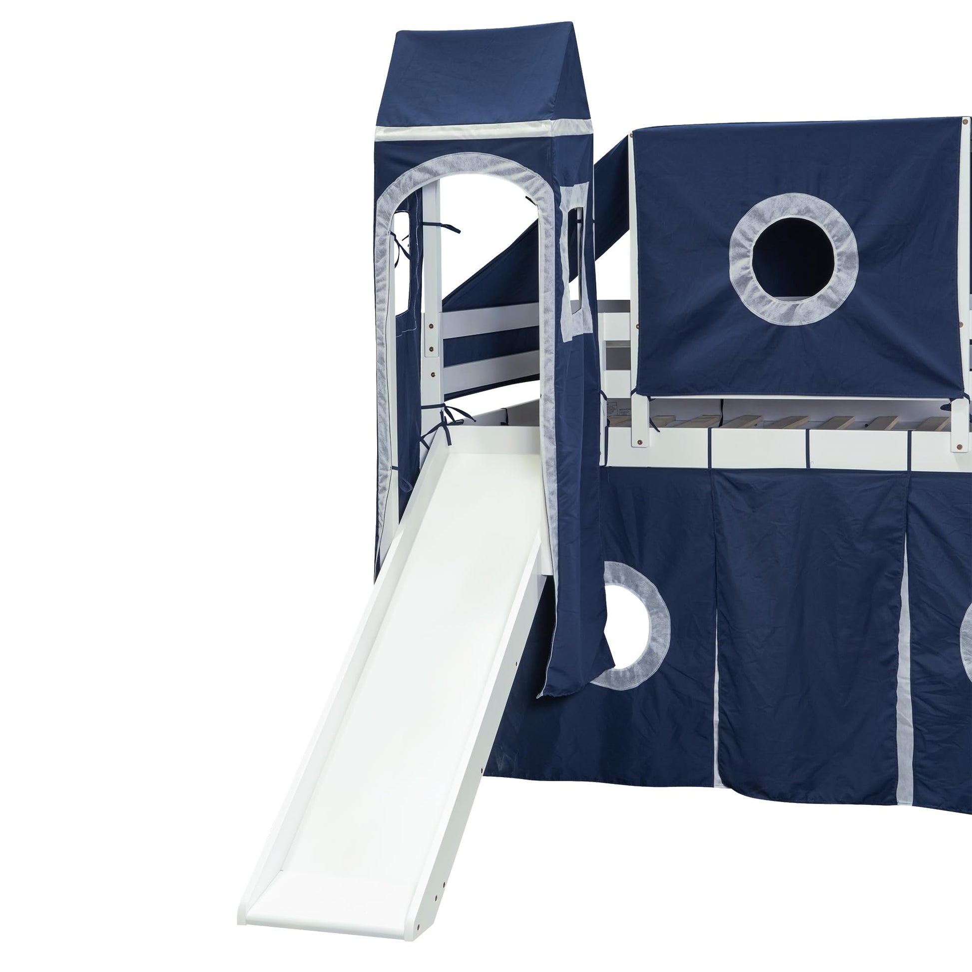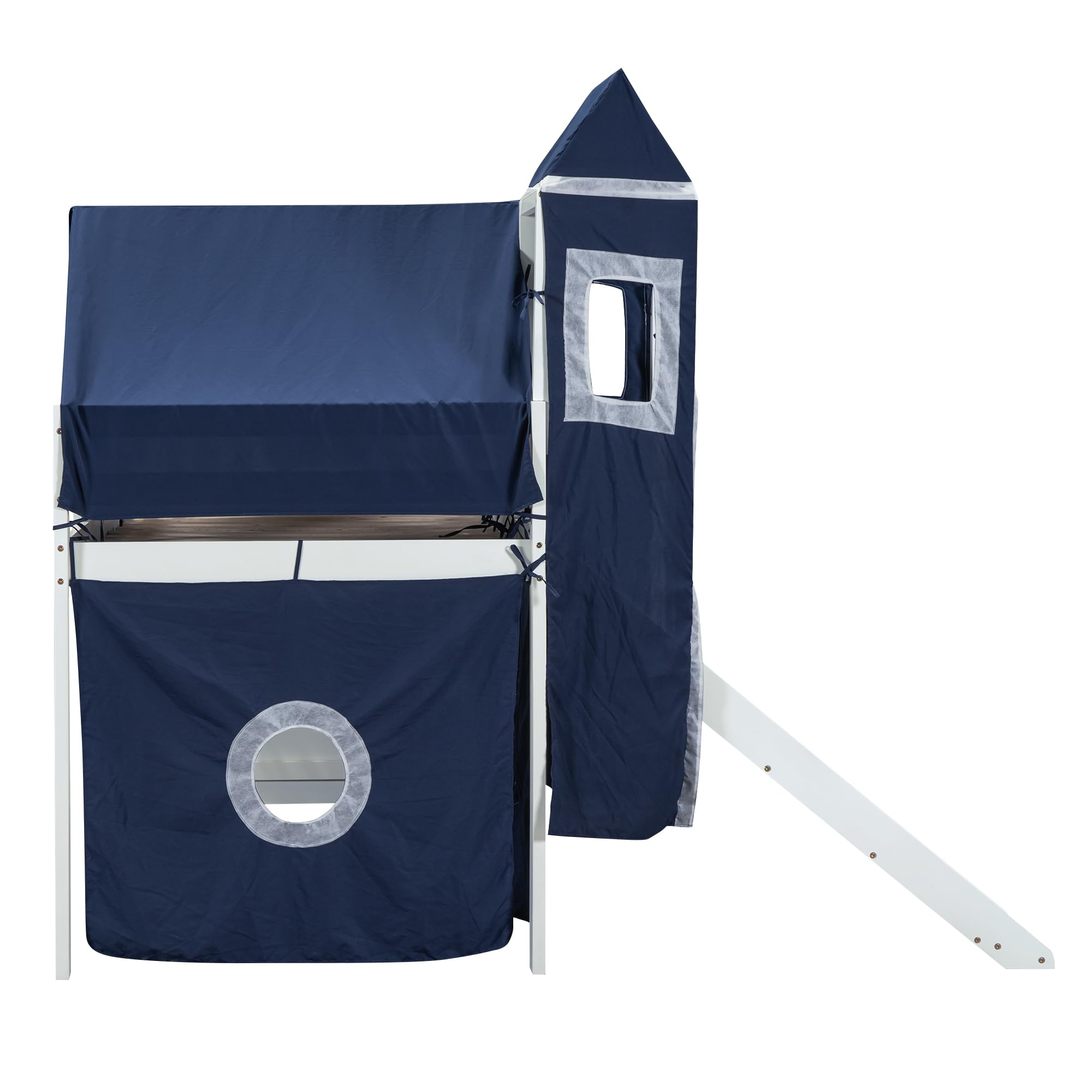 Designs House Loft Bed with Slide and Storage Stairs, Wood Kids Loft Bed with Tent and Tower