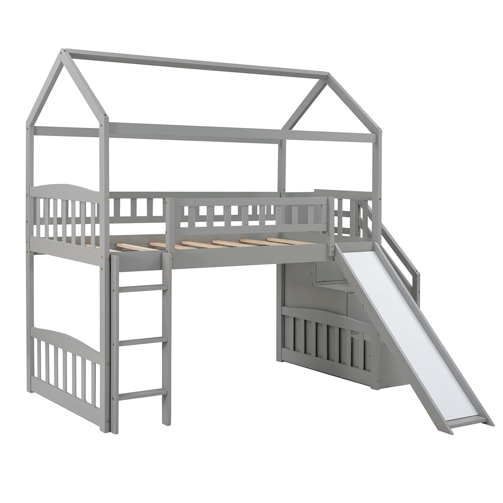 - This loft bed with slide is perfect gift for both boys and girls, house loft bed frame is a value conscious choice as it does not require a box spring or foundation. Just place your mattress on (mattress not included) and enjoy precious playground time. This twin loft bed for kids is came in 3 boxes, sometimes the three boxes will not arrive in same date, hope you can wait for 2-3 more days or contact us for more help.