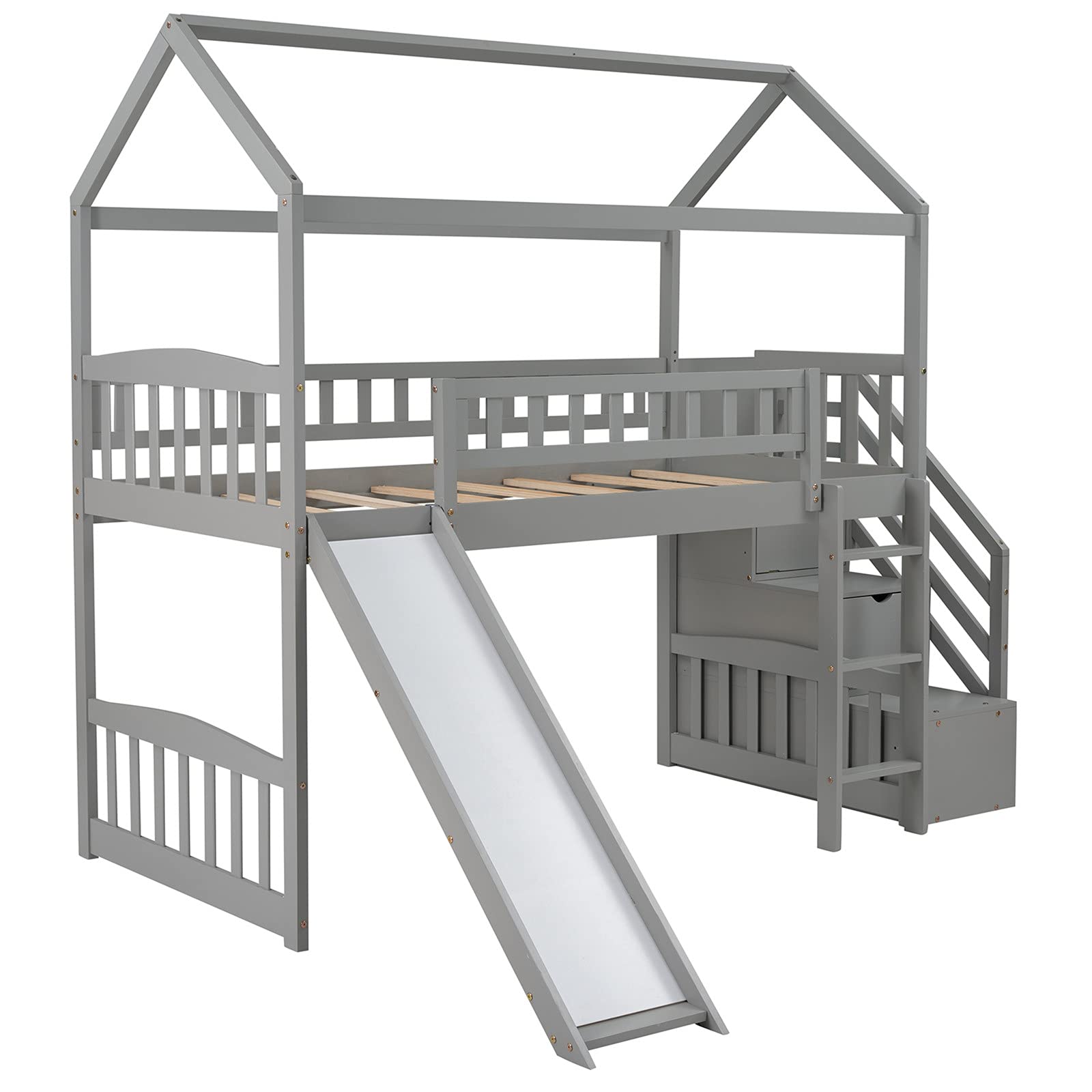 Loft Bed with Slide, House Loft Beds Twin Size with Step Storage Drawers Stairway