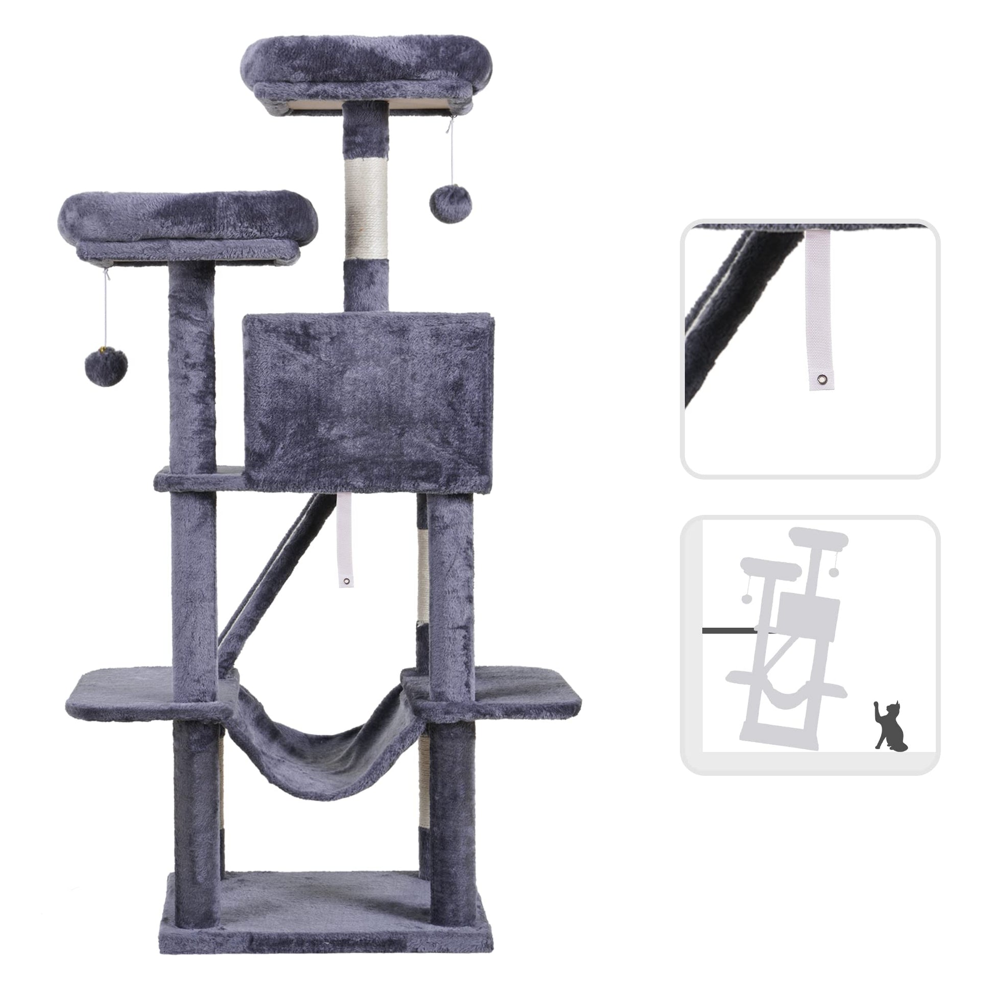 - Ample space for activities: Two large platforms provide more space for kitties to move around. The fleece hammock can add more fun