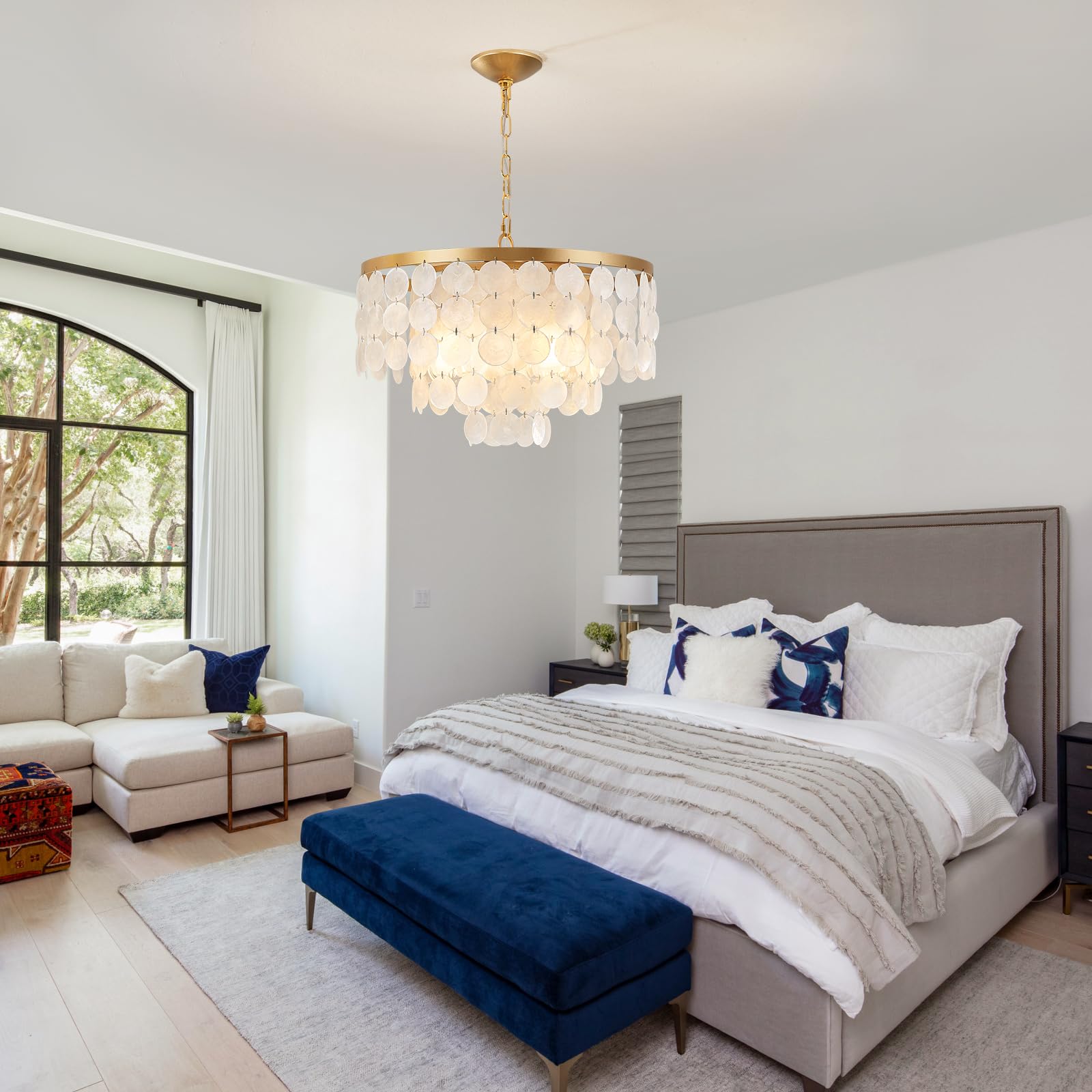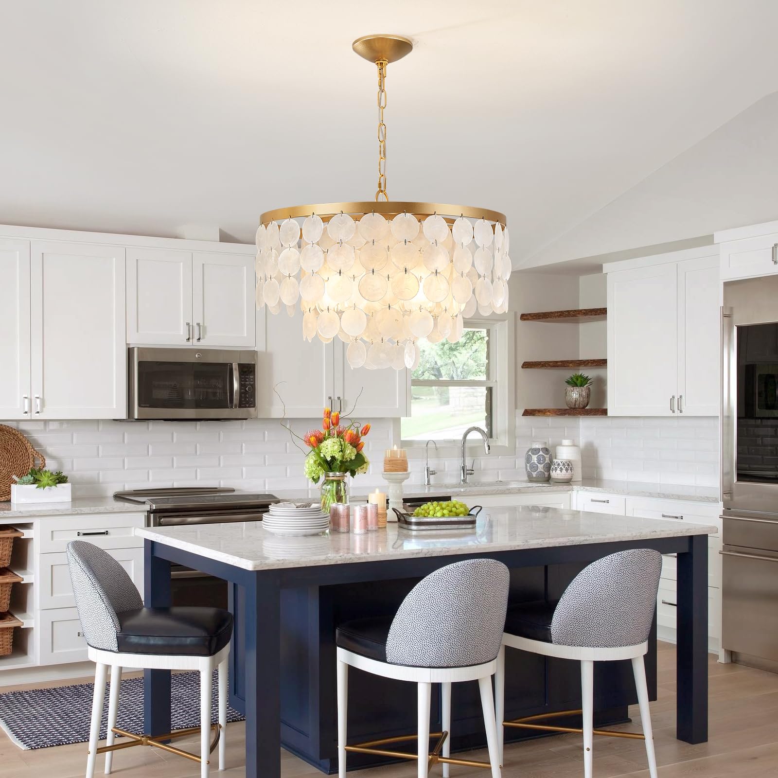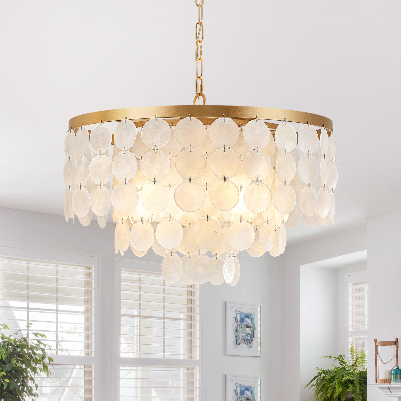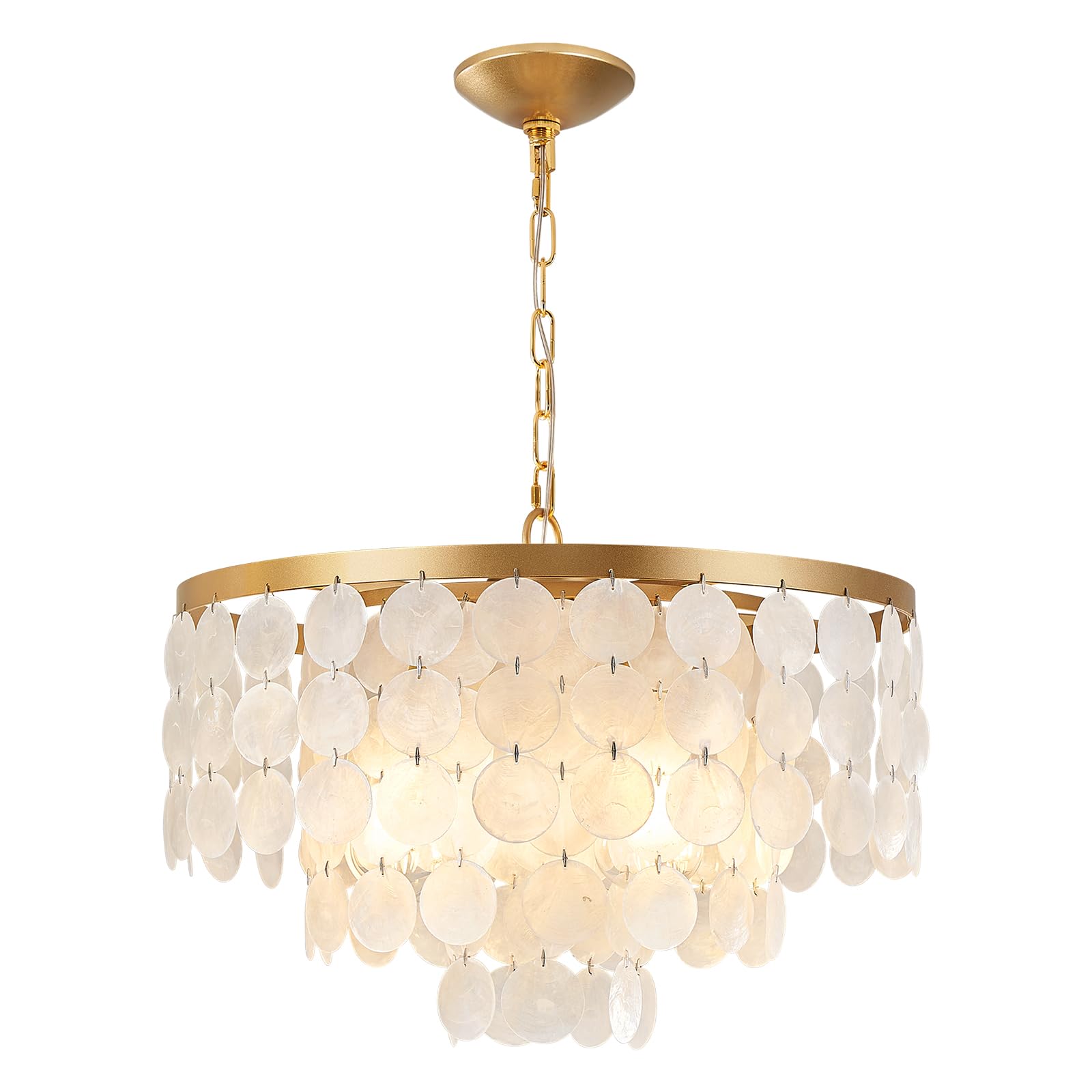 - NO GLARE DESIGN:Pearl shell chandelier hides the light ;well. To avoid the light is glaring when you are reading,cooking,working.