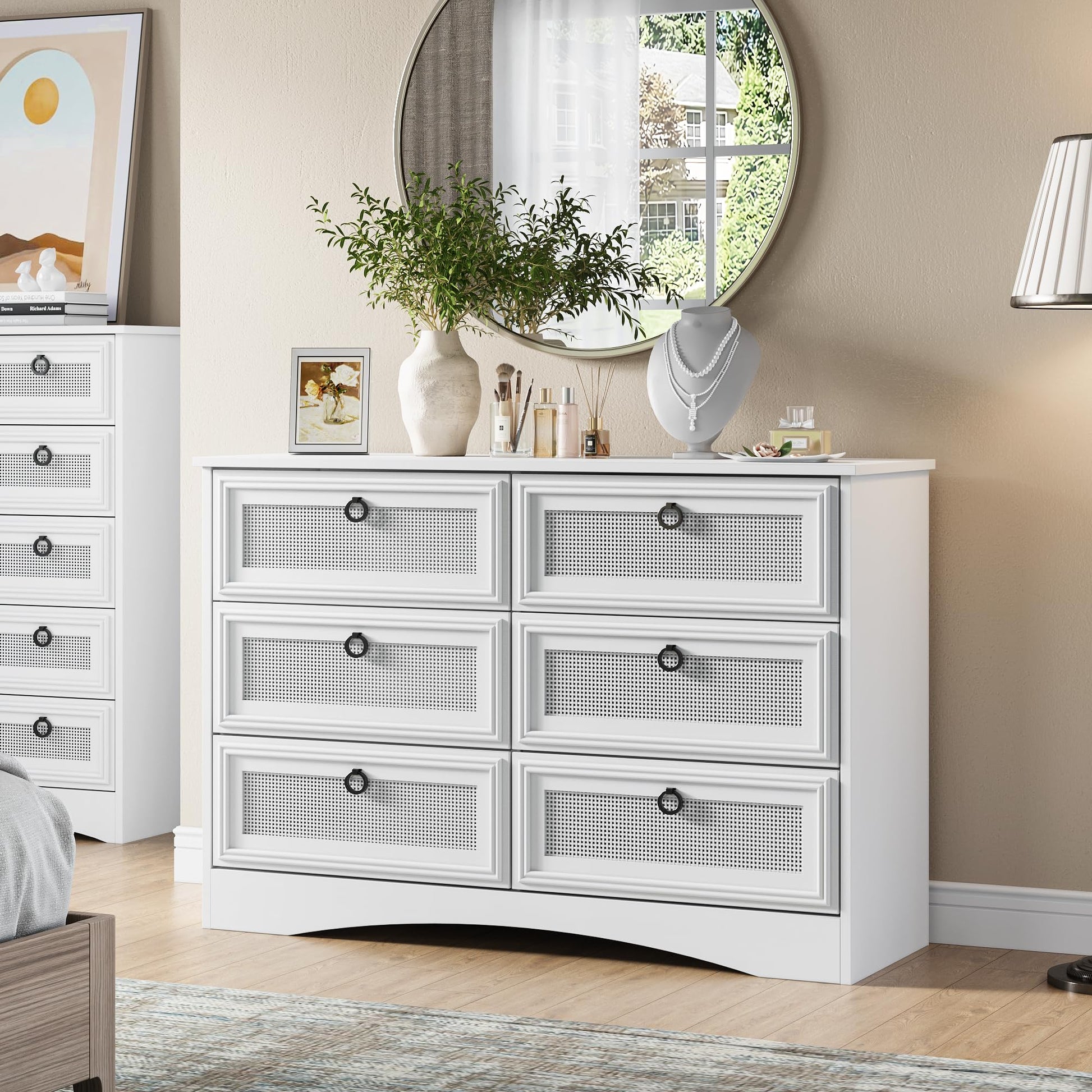 6 Drawer Dresser for Bedroom, White Rattan Dresser