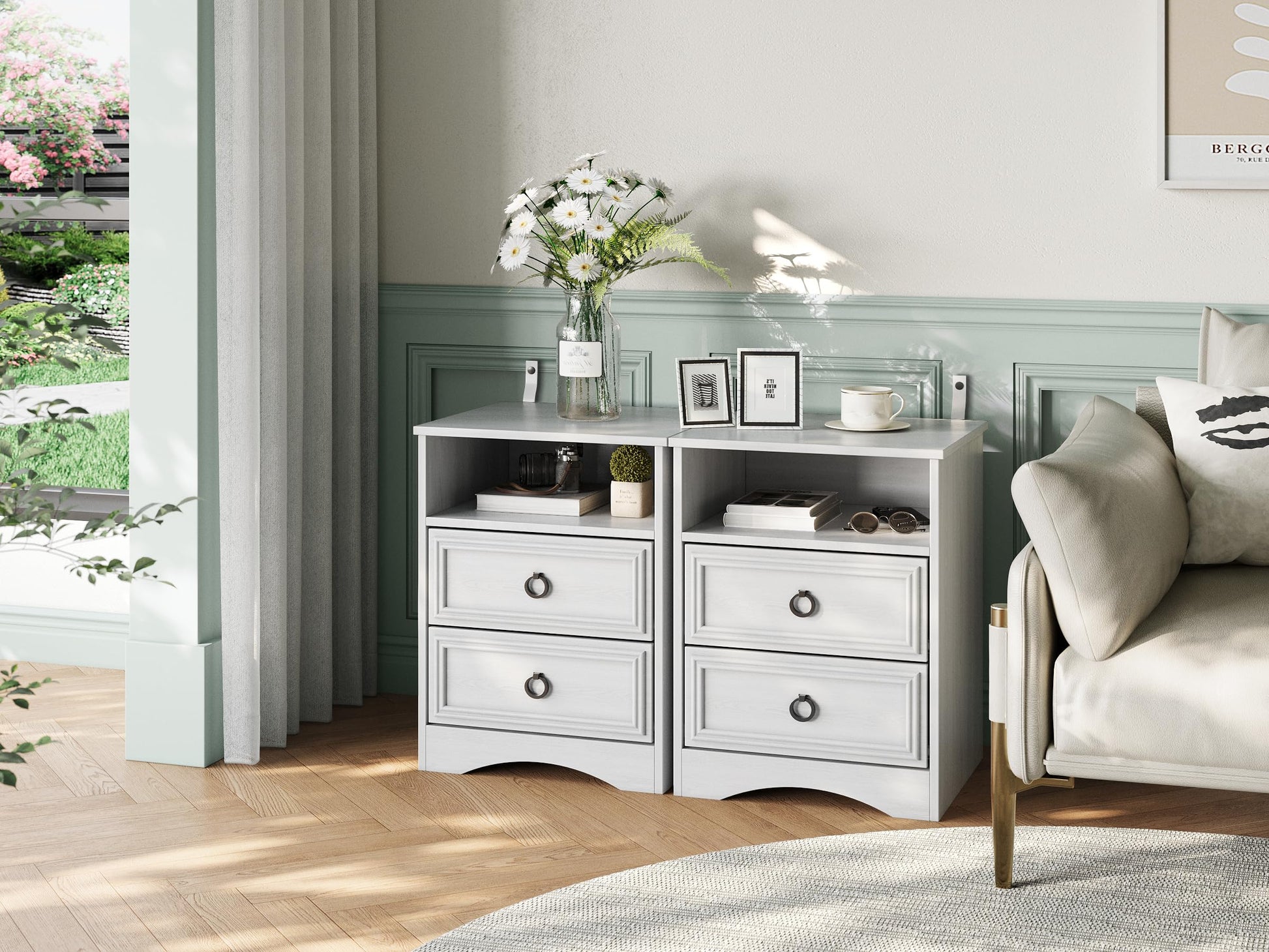 - Bed Side Table with 2 drawers are all equipped with wide slides, get painstaking treatment for smooth gliding and easy use. The brackets allow the drawers to come out of the dresser, clothing and socks can be stack to conserve space.
