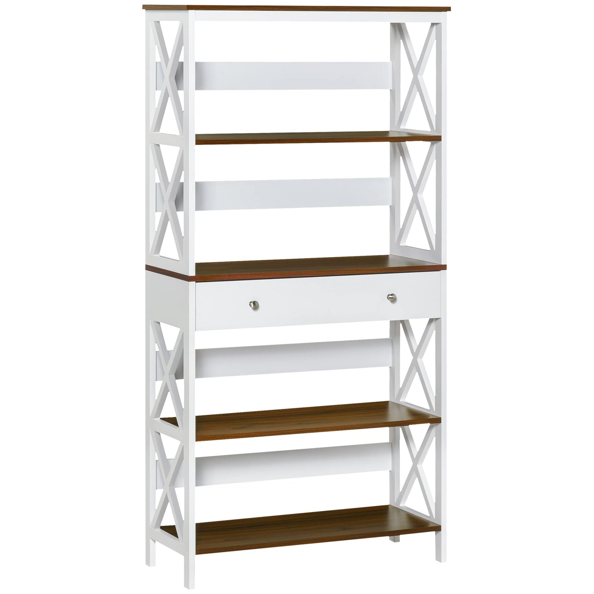 4-Tier Shelving Bookcase Storage Cupboard with Pull Out Drawer, and Wooden Frame with X Bar Stability, White