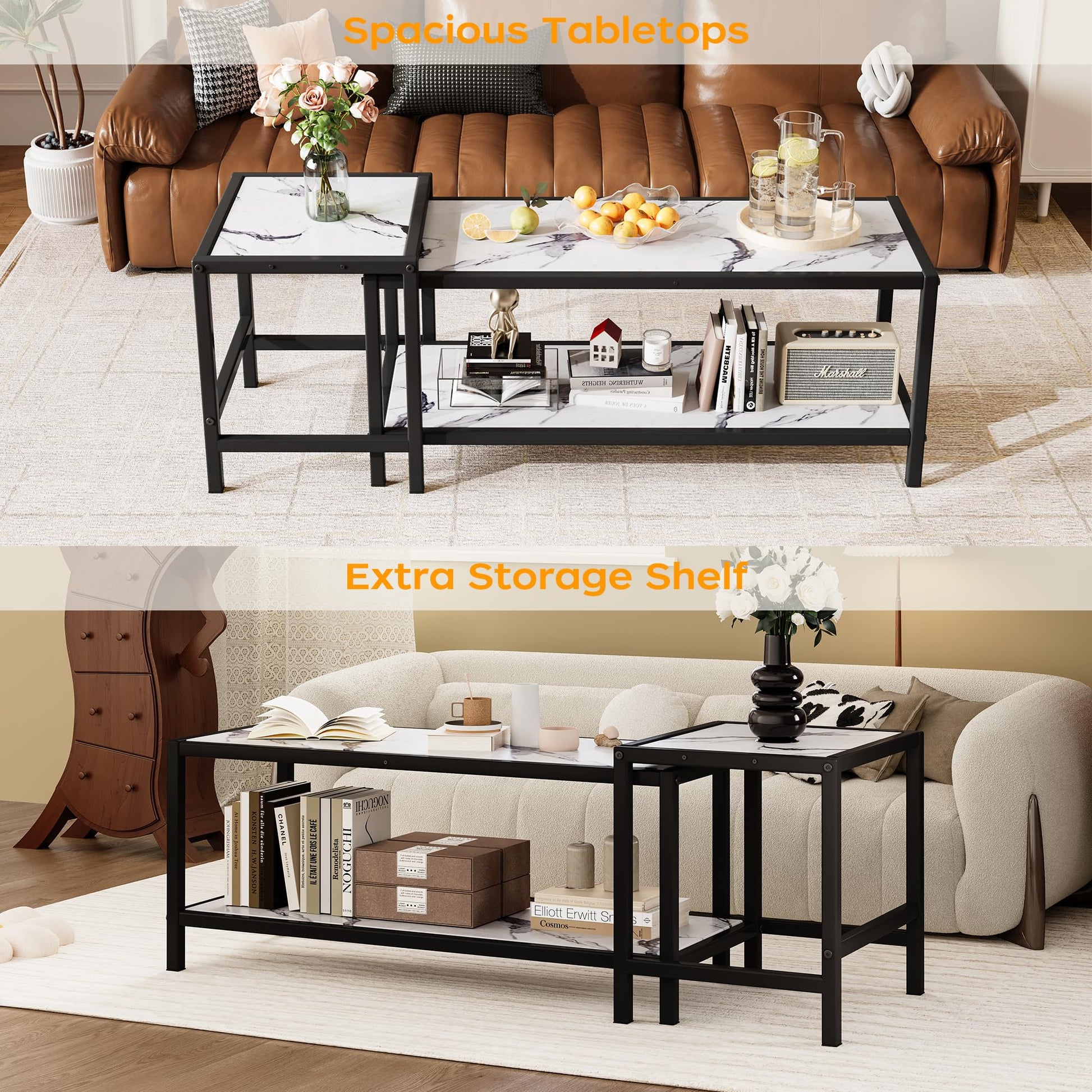 - Our nesting coffee tables offer versatility by allowing separate or stacked usage, saving space, and facilitating placement in various locations. The white faux marble pattern, combined with a black matte metal frame featuring minimalist lines and no extra decoration, ensures a timeless style that complements any room decor and other furniture accessories.