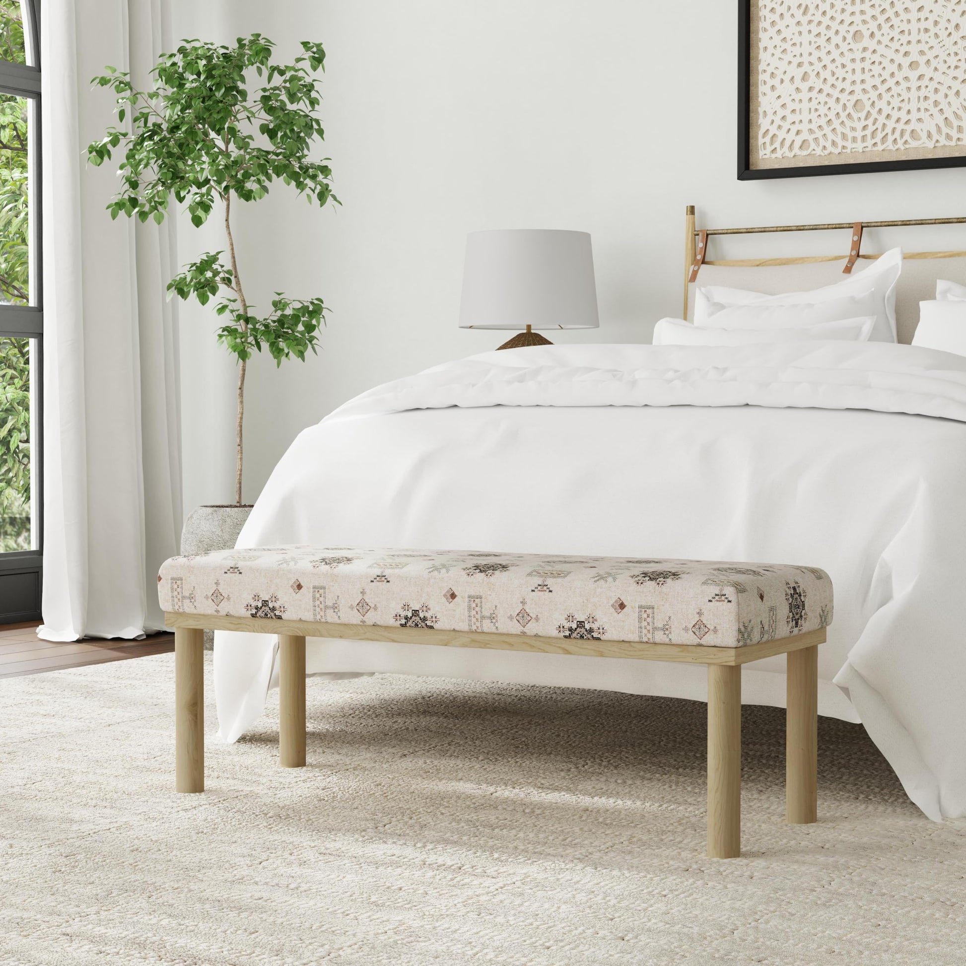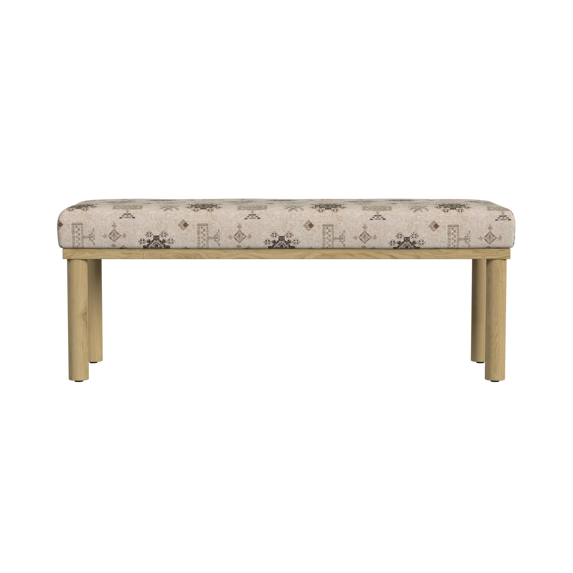 - OTTOMAN BENCH Featuring a classic cream global pattern with the natural wood styling of the round legs. Our decorative industrial bench is often used as an coffee table ottoman or for extra seating in your living room