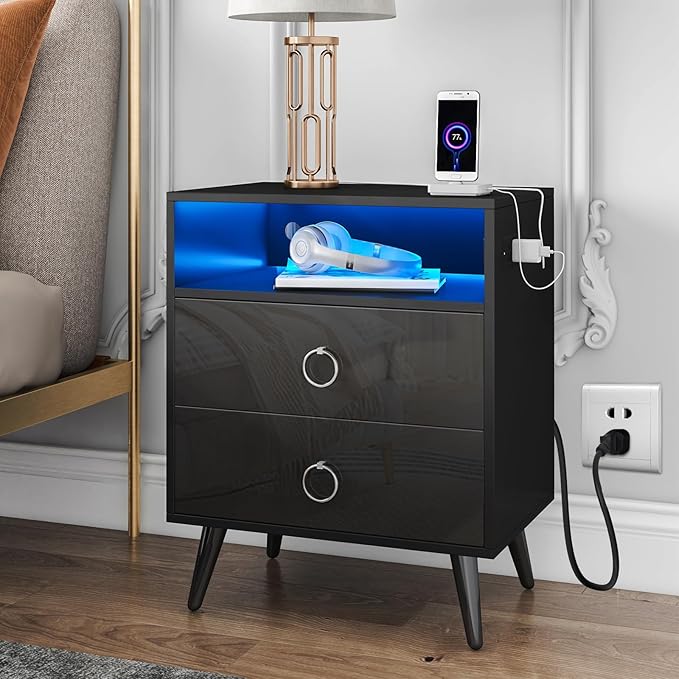 - The modern led nightstand is made of well crafted particleboard wood, which has a durable structure. With simple and stylish appearance, the front panel of the drawer is a high-gloss finish, which enhances the sense of visual space.