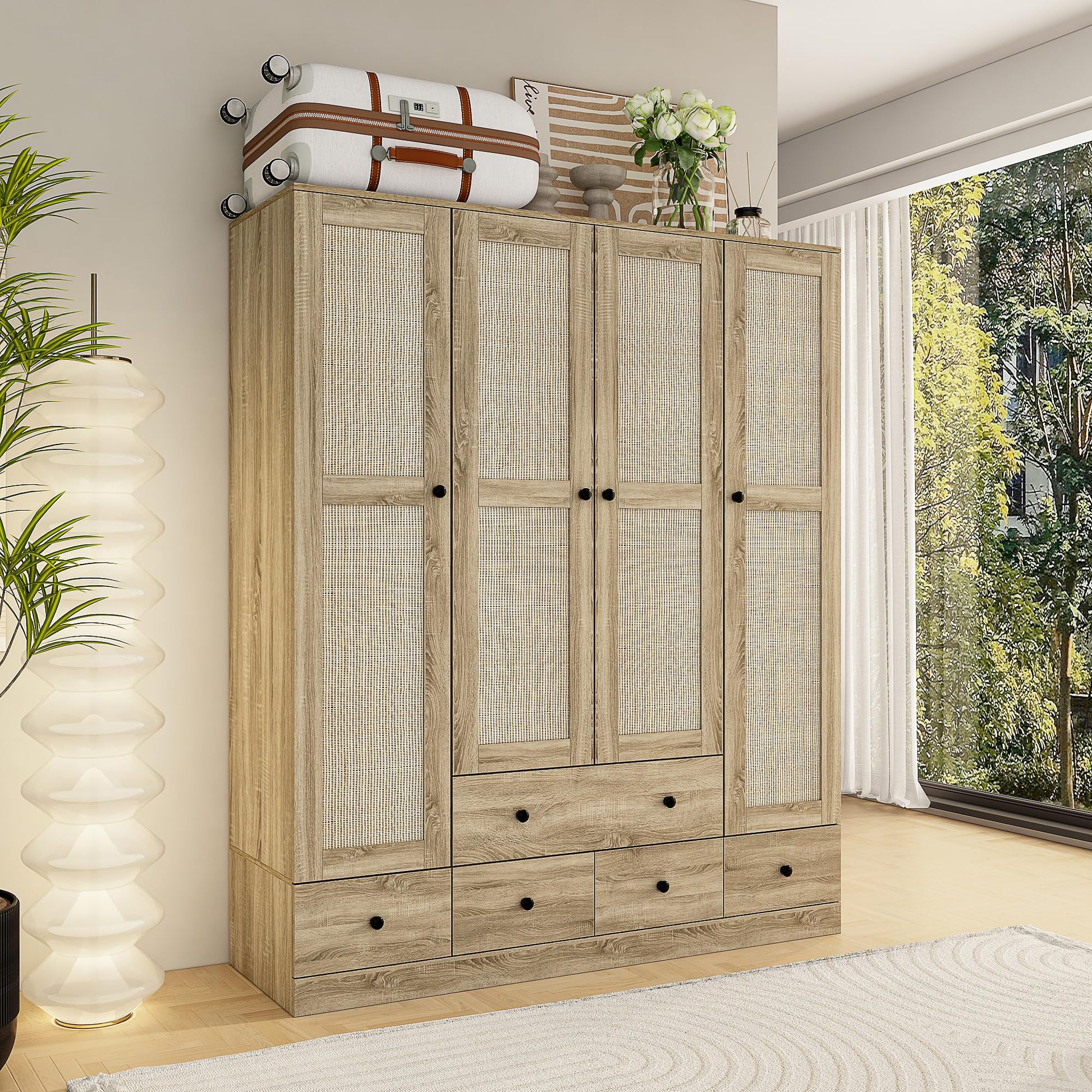 4 Door Wardrobe Armoire Closet, Bedroom Cabinet Armoire with Rattan Doors