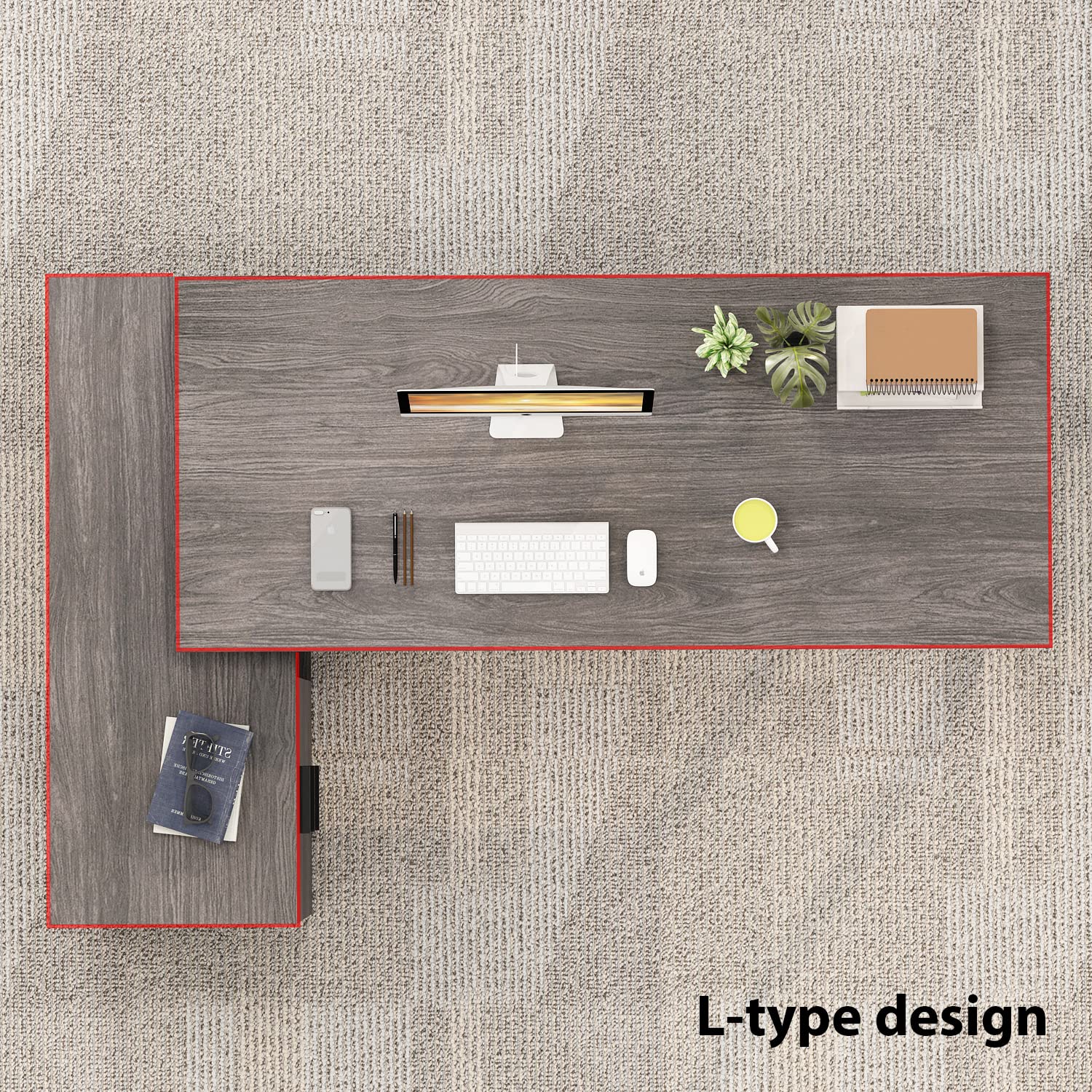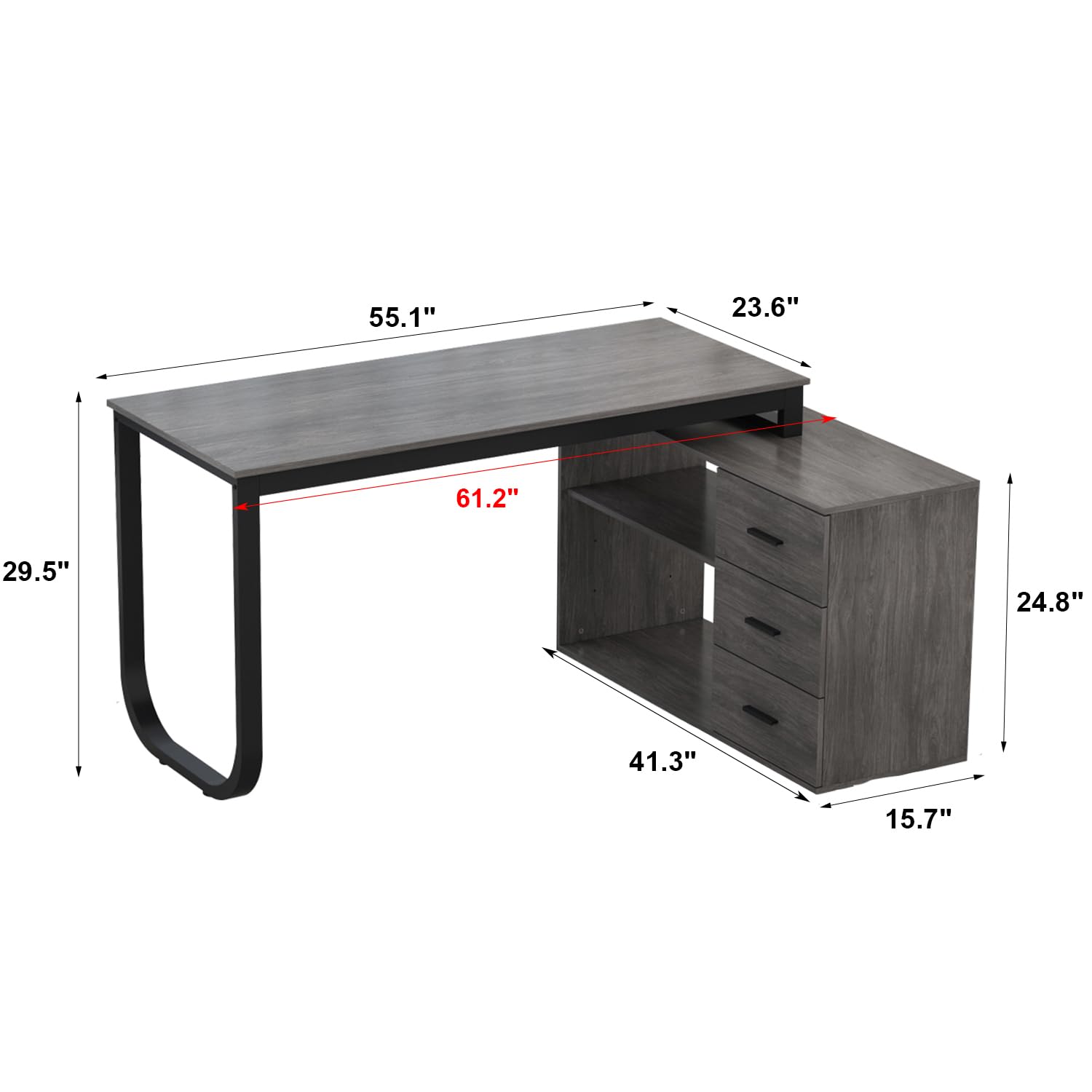 - This L-shaped computer desk offers adequate working space. The wide desktop can hold many office supplies, such as monitors, table lamp, books, files, etc. Dimensions of the Desk: 55.1”L x 23.6”W x 29.5”H