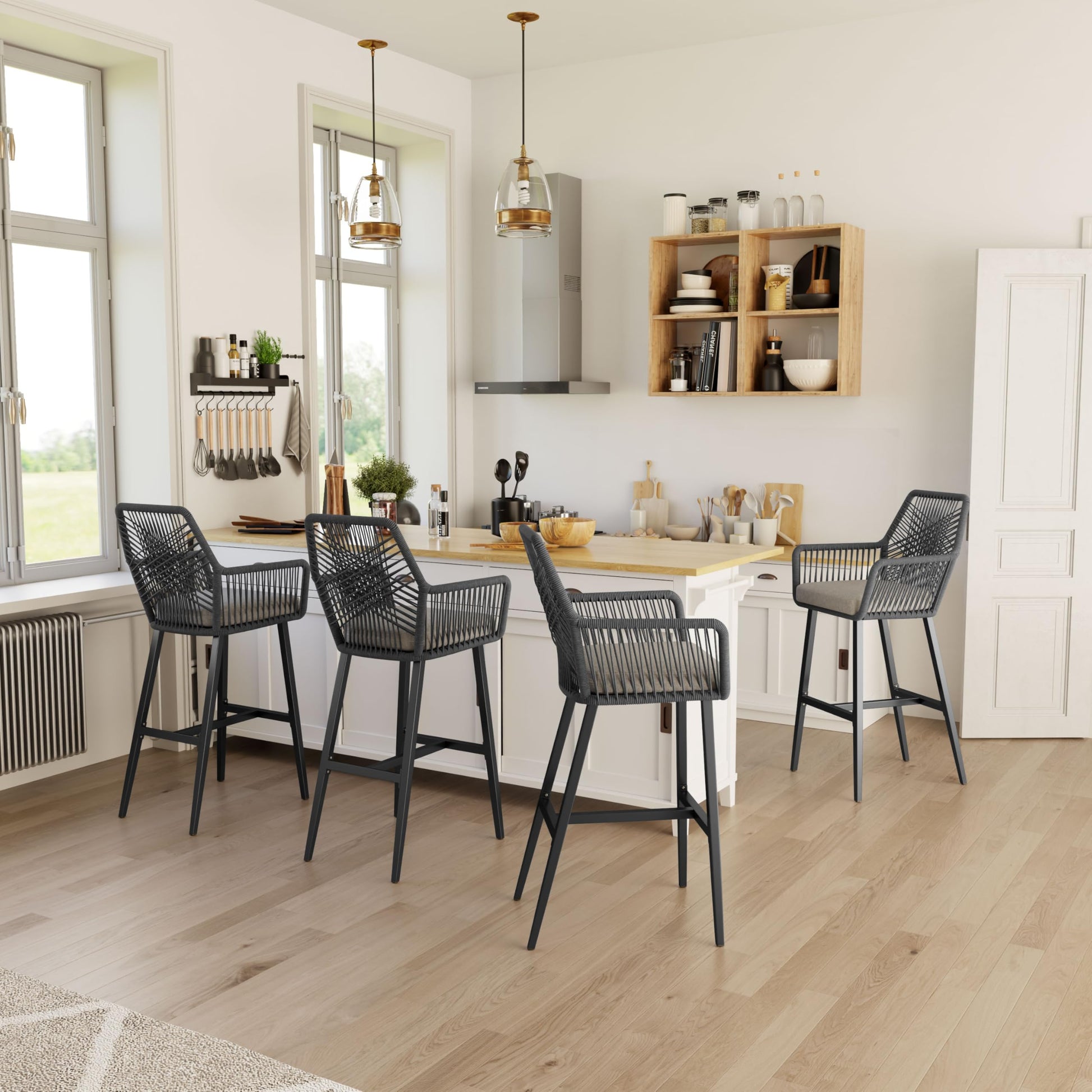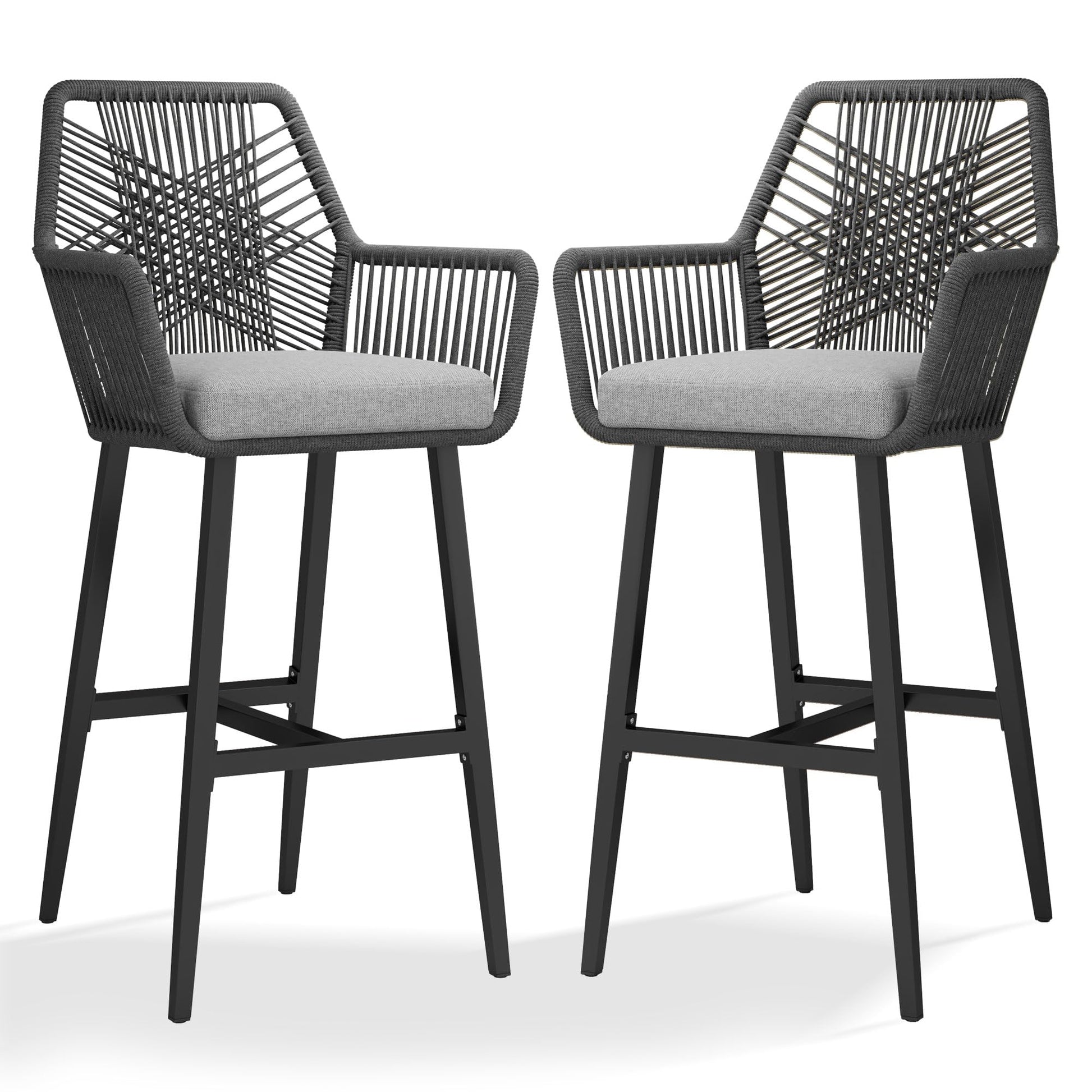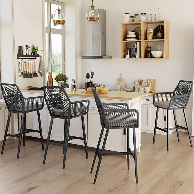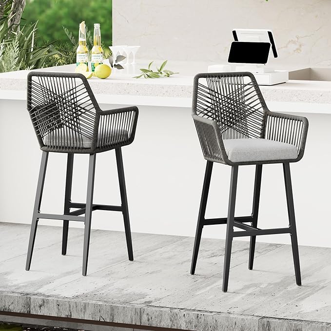 - The bar stools are crafted from Weather resistant & UV resistant braided rope and rust-resistant aluminum, these bar stools are built to last. The durable materials ensure they can withstand both indoor and outdoor use, making them perfect for patios, gardens, pools, and kitchens