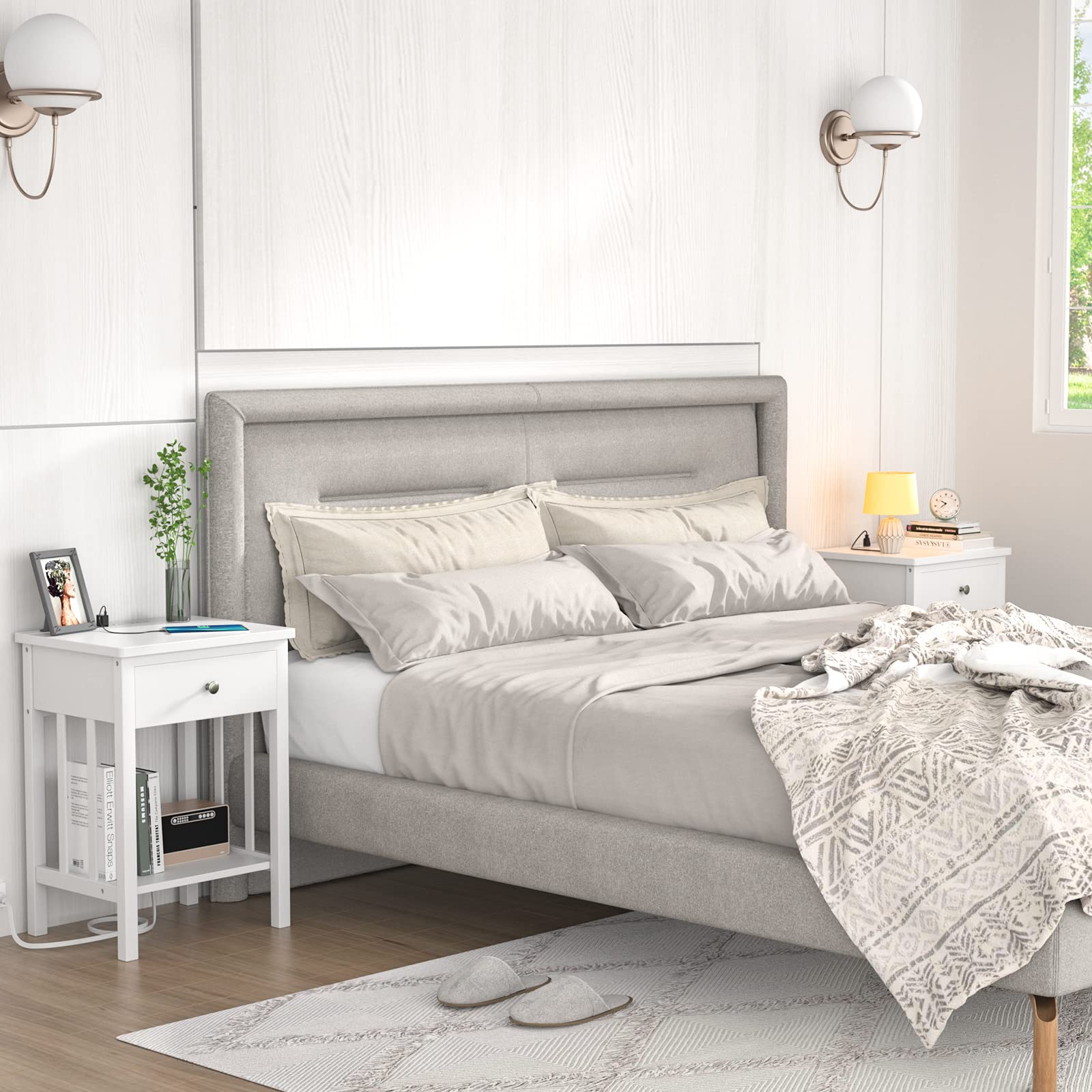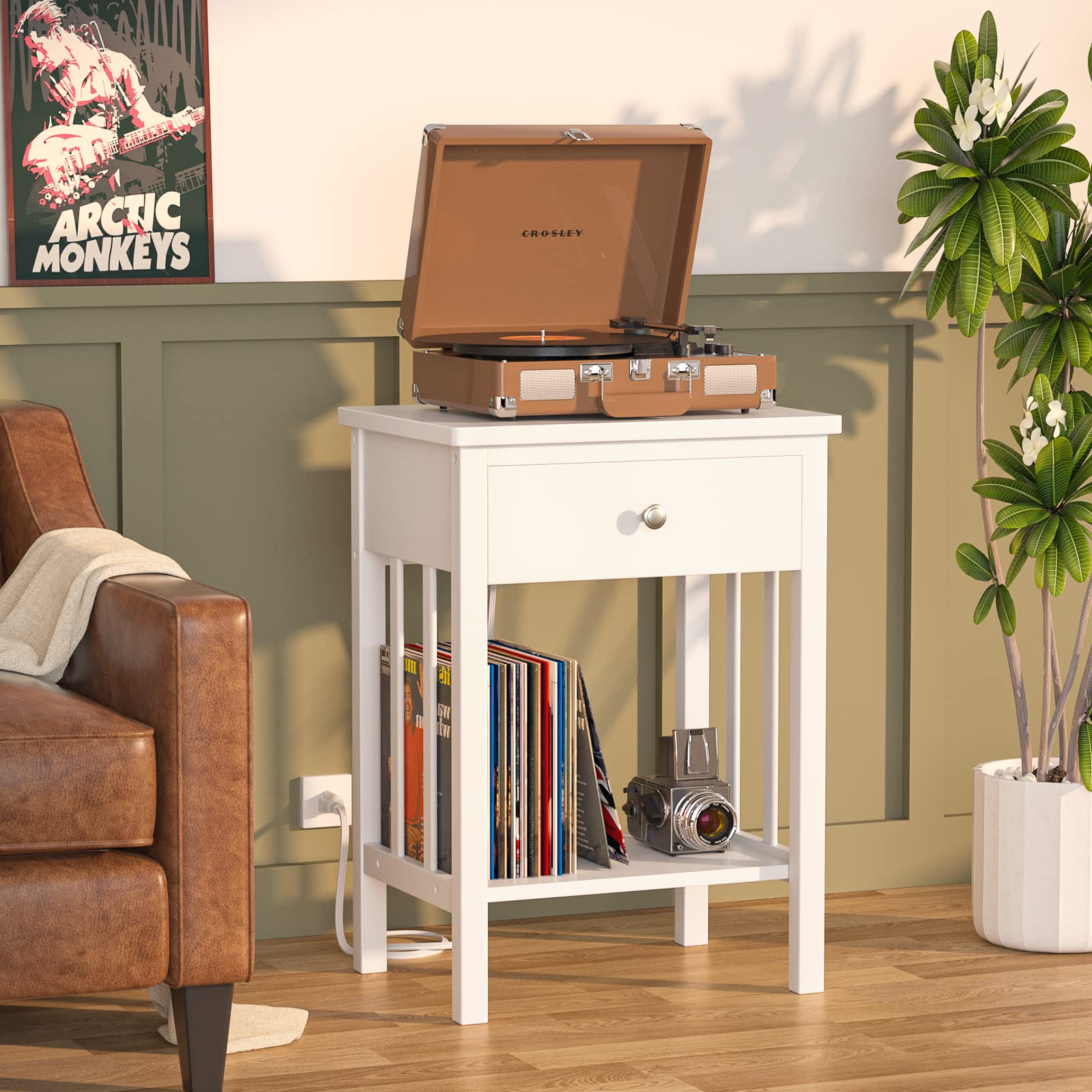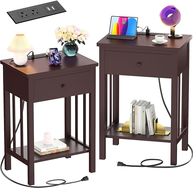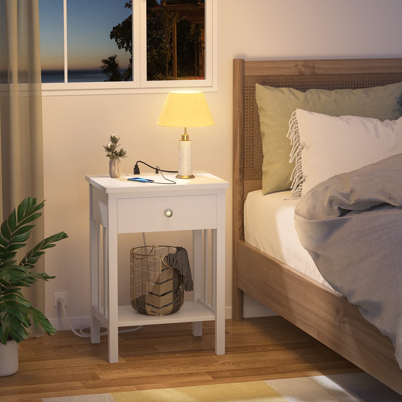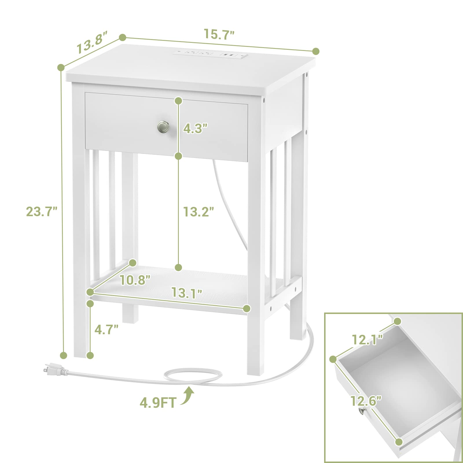 - Nightstand with Charging Station - Keep all your essential devices charged and within arm's reach with our convenient white nightstand with a built-in charging station. Featuring 2 USB ports and 2 outlets, you can easily charge multiple devices at once. The 4.9ft power cord offers the flexibility to move the charging nightstand wherever you want in the bedroom or living room.