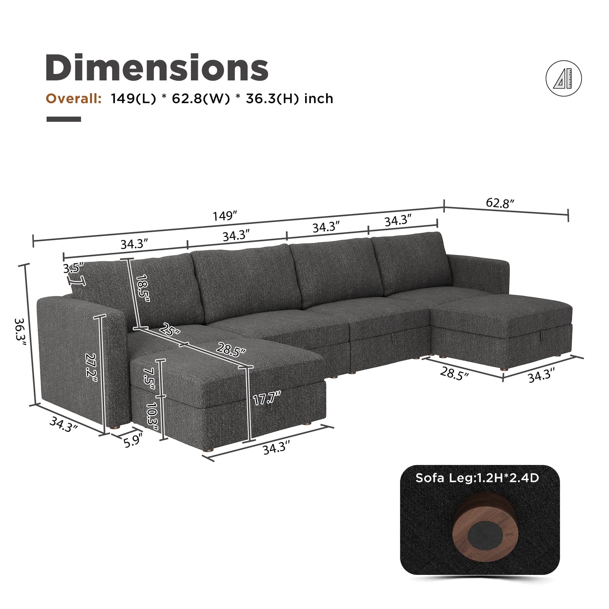 - The overall size of the modular sofa :149 "W x 62.8" D x 36.3 "H, the size of storage space under each seat is: 29.9''W*24.4''D*7.1''H.The modular sofa include 12 packages in all