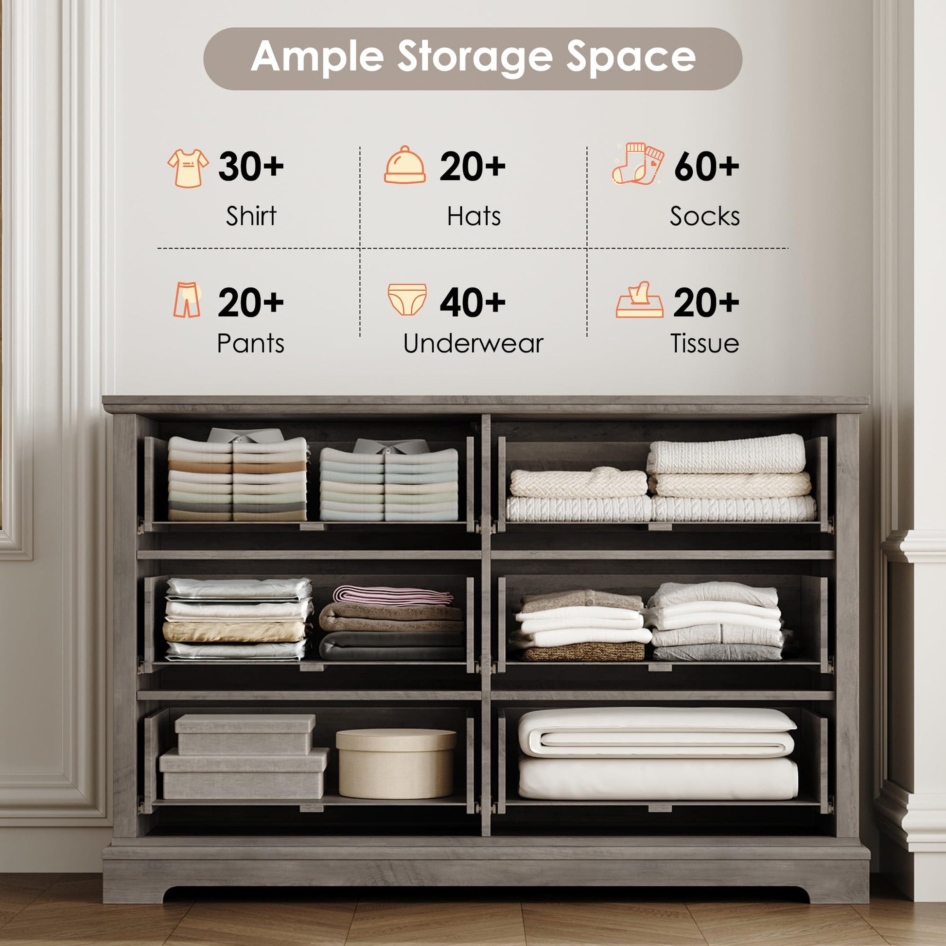 - Storage Master Featuring 6 spacious drawers to store things with more classification such as toys and books to meet different needs, this accent dresser frees up your space but looks great. With a wide tabletop, you can put a lamp or an aroma diffuser on it for an extra homey touch