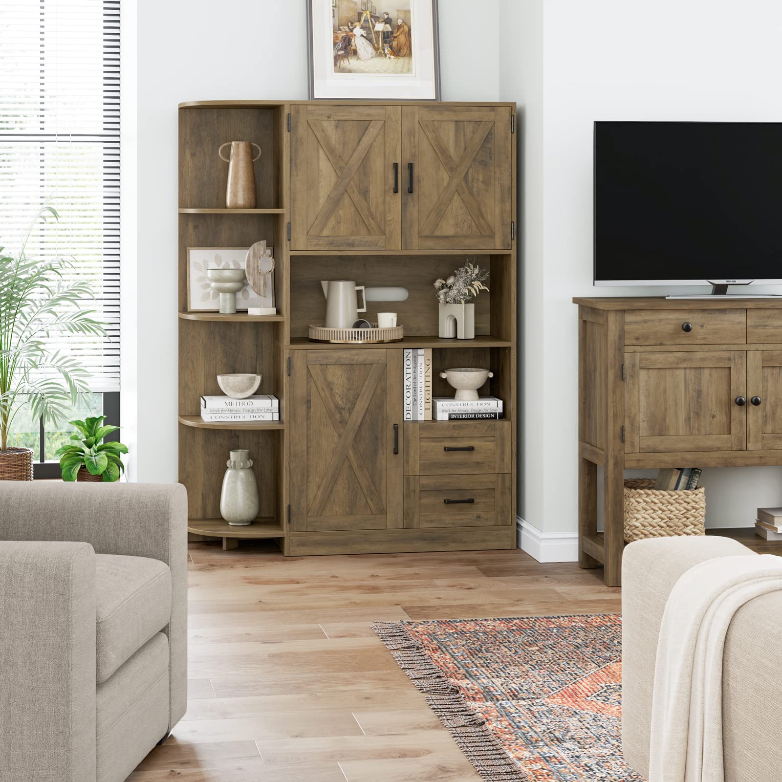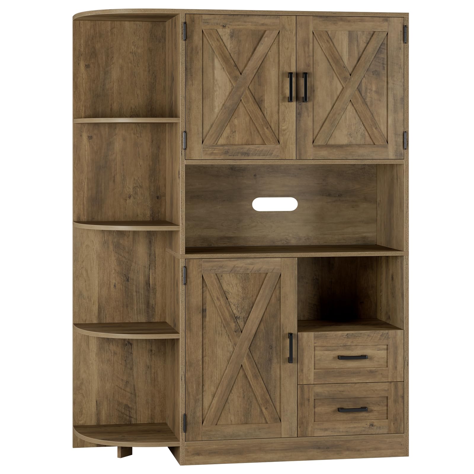 HOSTACK 60.4" Farmhouse Kitchen Pantry Storage Cabinet, Freestanding Hutch with Doors & Shelves, Buffet Sideboard with Microwave Stand, Coffee Bar with Drawers, Cupboard for Dining Room, Rustic Brown