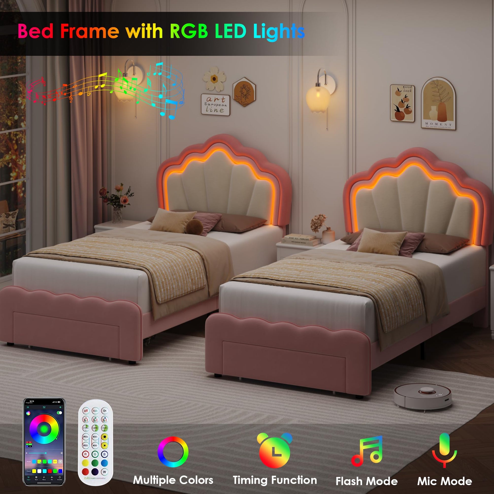Twin Upholstered LED Bed Frame with Storage Drawer, Cute Girls Bed with Adjustable