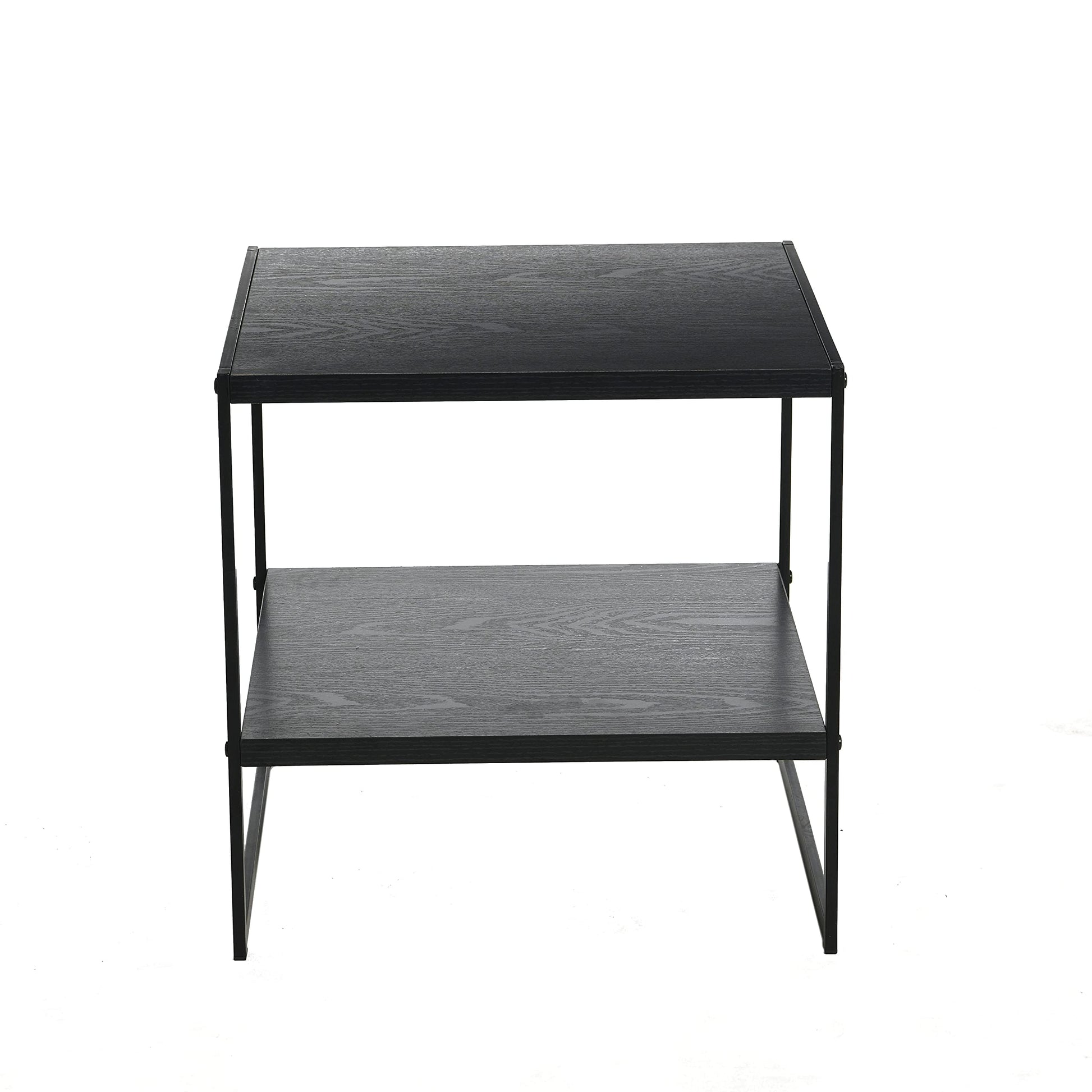 - With a chic black metal frame and faux wood grain shelves.