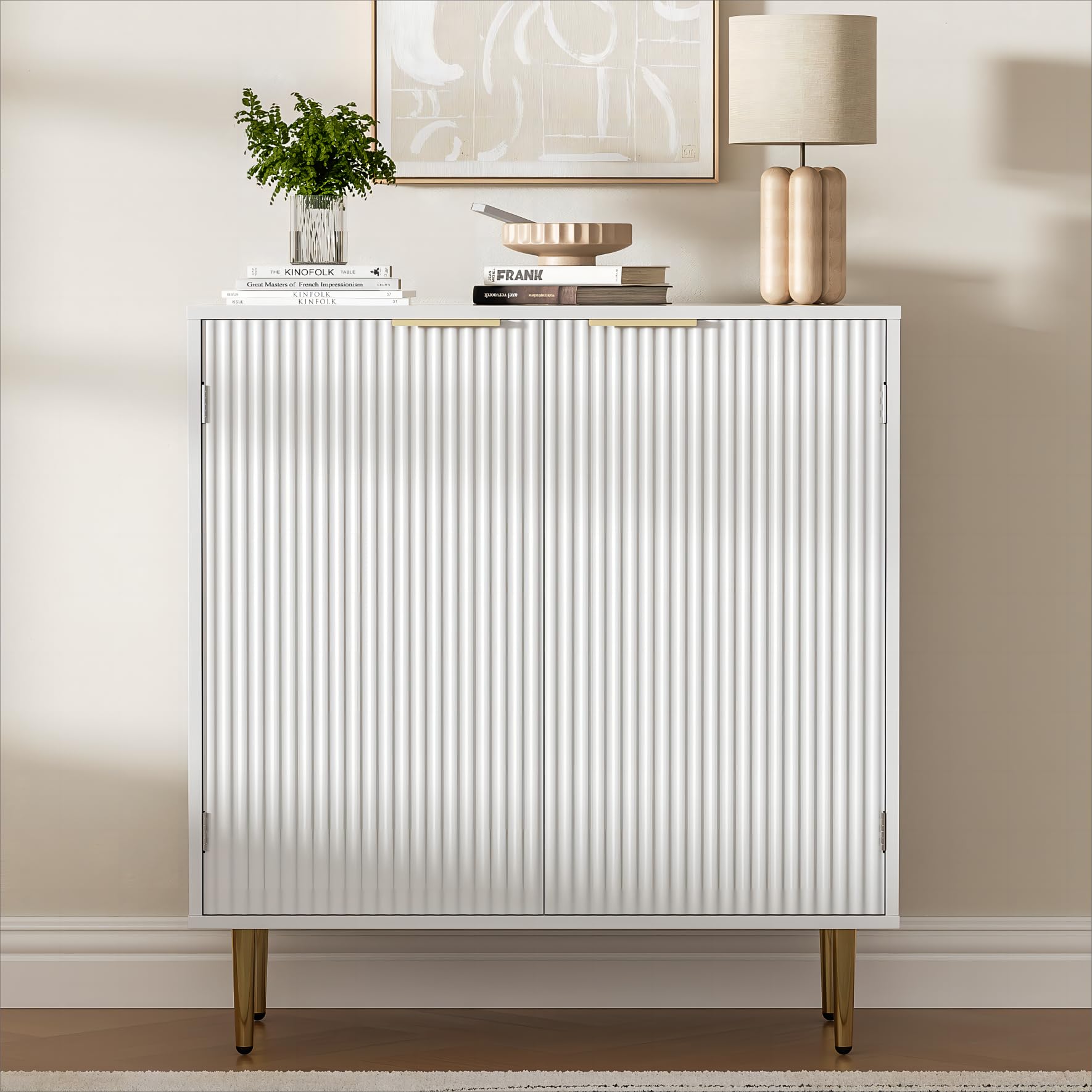 - The panels of this storage cabinet boast an arc wave design, radiating a refined yet effortless style while highlighting texture and allure. Enhanced with golden cabinet handles and feet, it effortlessly epitomizes the essence of casual luxury, elevating the style and sophistication of your space.