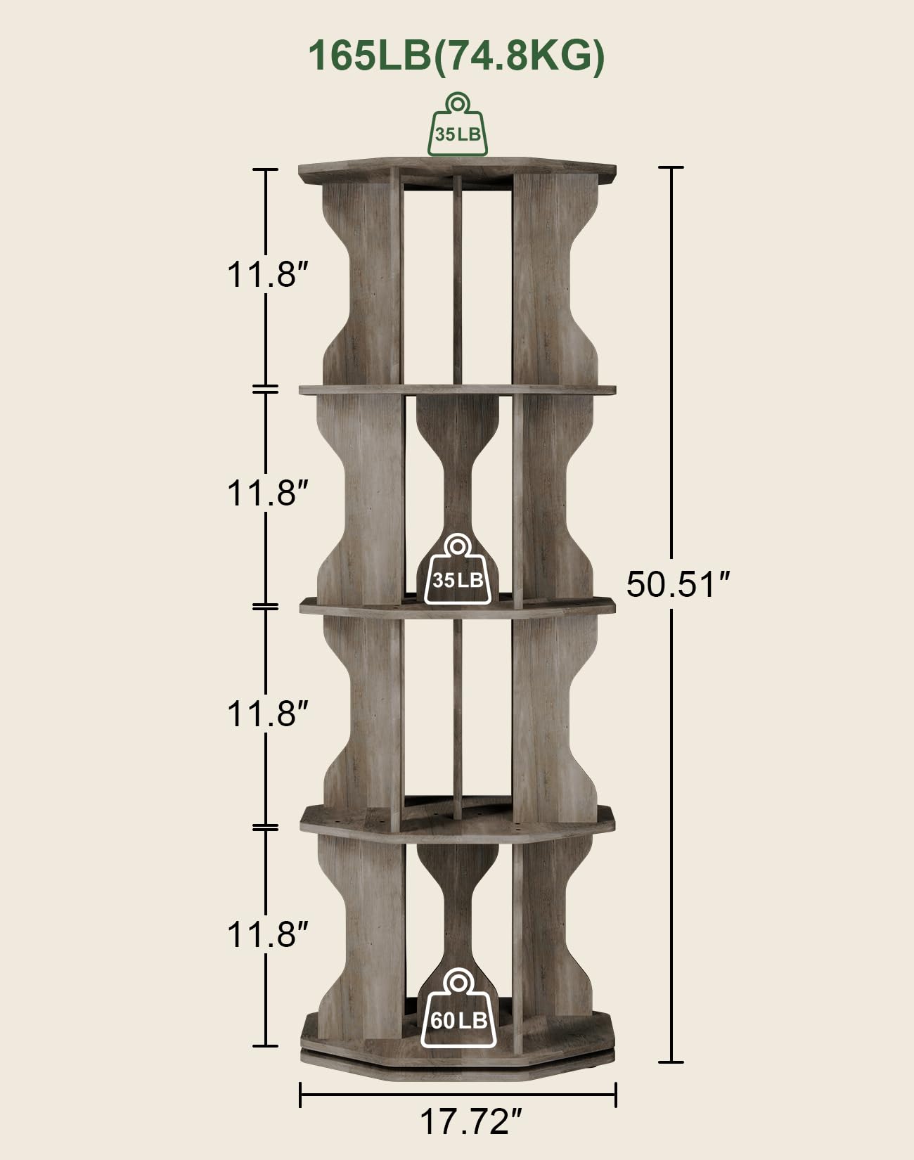 - This rotating bookshelf tower offers impressive practicality and spaciousness, holding 60-80 standard books (A4 size, 3/4 inch thick) and up to 13 oversized magazines (A3 size, 1/2 inch thick) on each shelf. With its 4-tier rotating design, you can maximize vertical space and easily organize your collection. It's also perfect for showcasing artwork, decorative items, and plants, blending aesthetics with functionality to create a tidy, inviting home environment