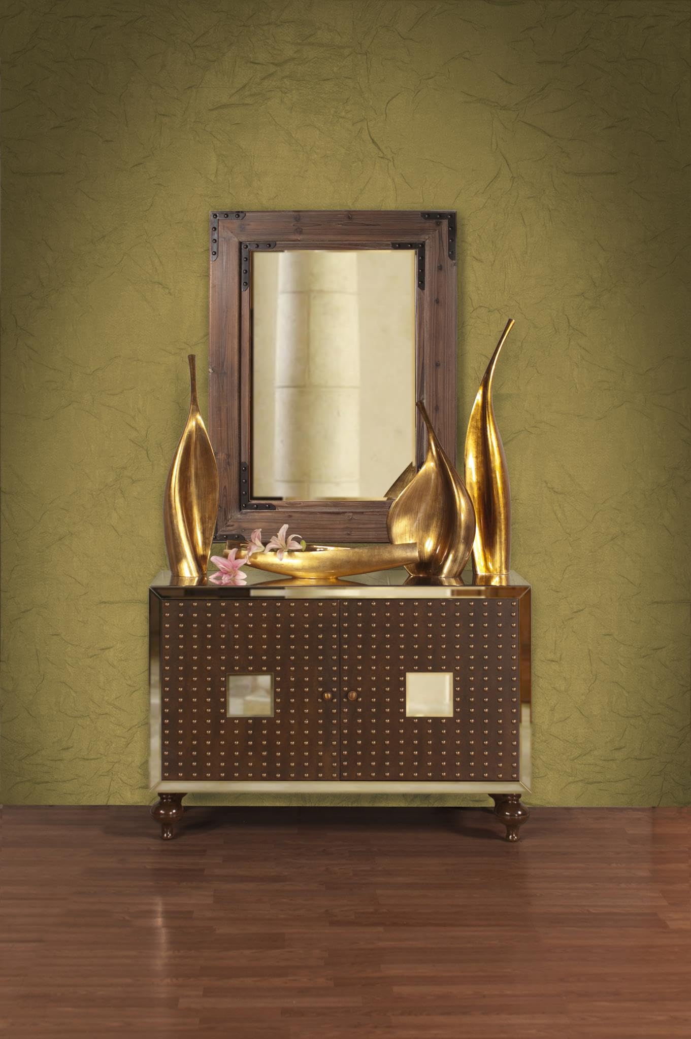 - WOOD FRAME - A brown stain elegantly colors the piece, allowing the beauty of the natural wood grain to shine through, and a black iron strip riveted to the frame adorns each corner