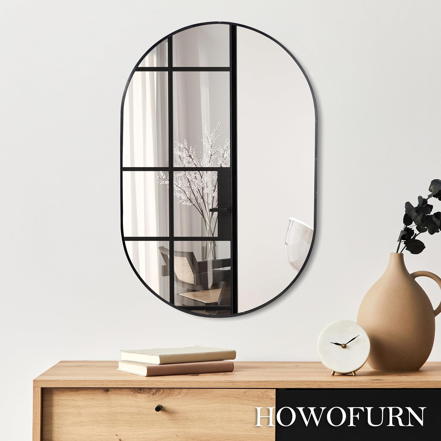 - The smooth 5mm float silver glass reflects an clear image without deformation. Howofurn wall mounted mirror is recessed into the frame and floated from the frame edges. The oval shape and the super-thin frame create a sense of solemn and order, extending visually space, depth, and light. Not only can it better show your figure, but at the same time, there is no fancy decoration that affects the overall view, helping you dress yourself every day.