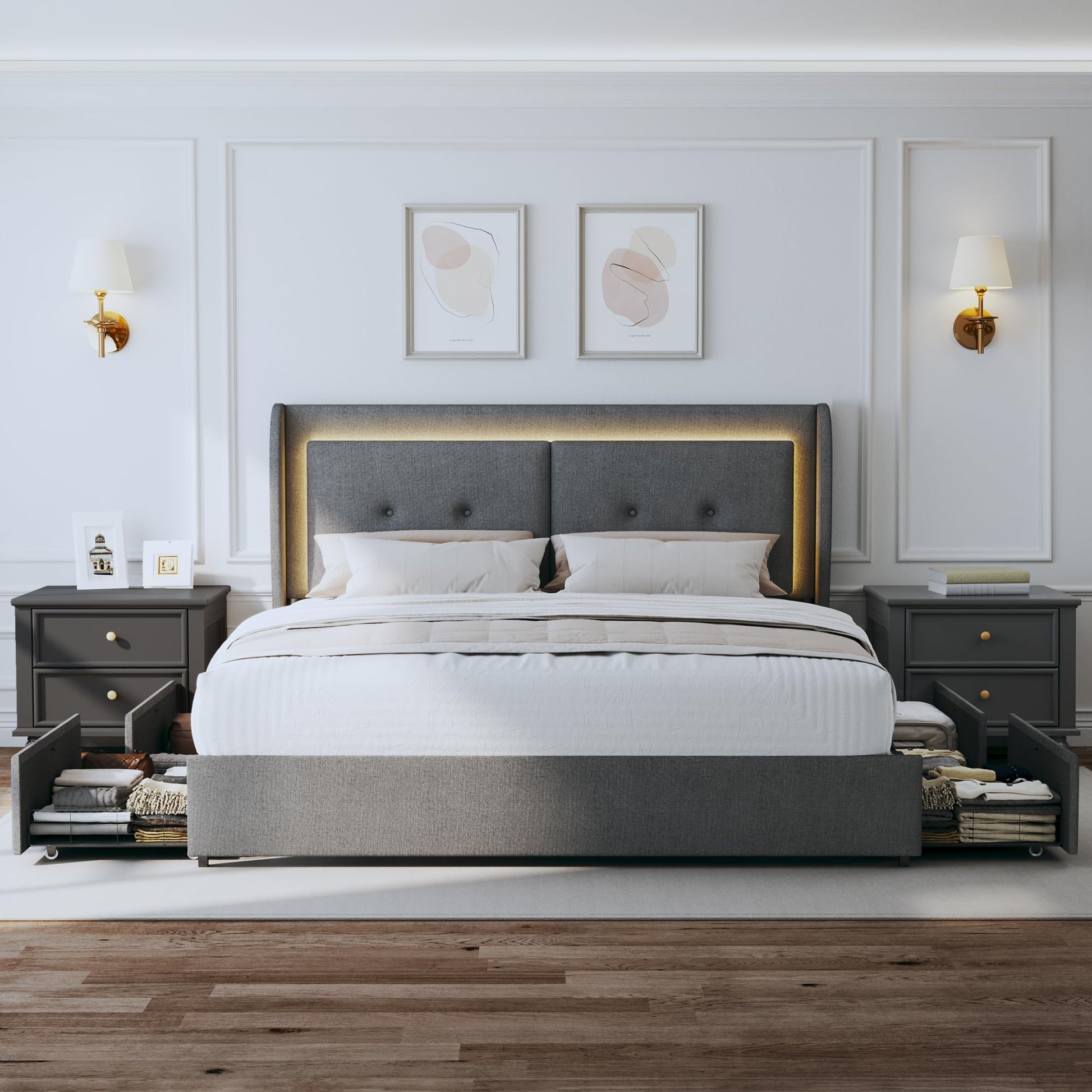 Full Size Bed Frame with Storage Drawers, Upholstered LED Full Size Bed