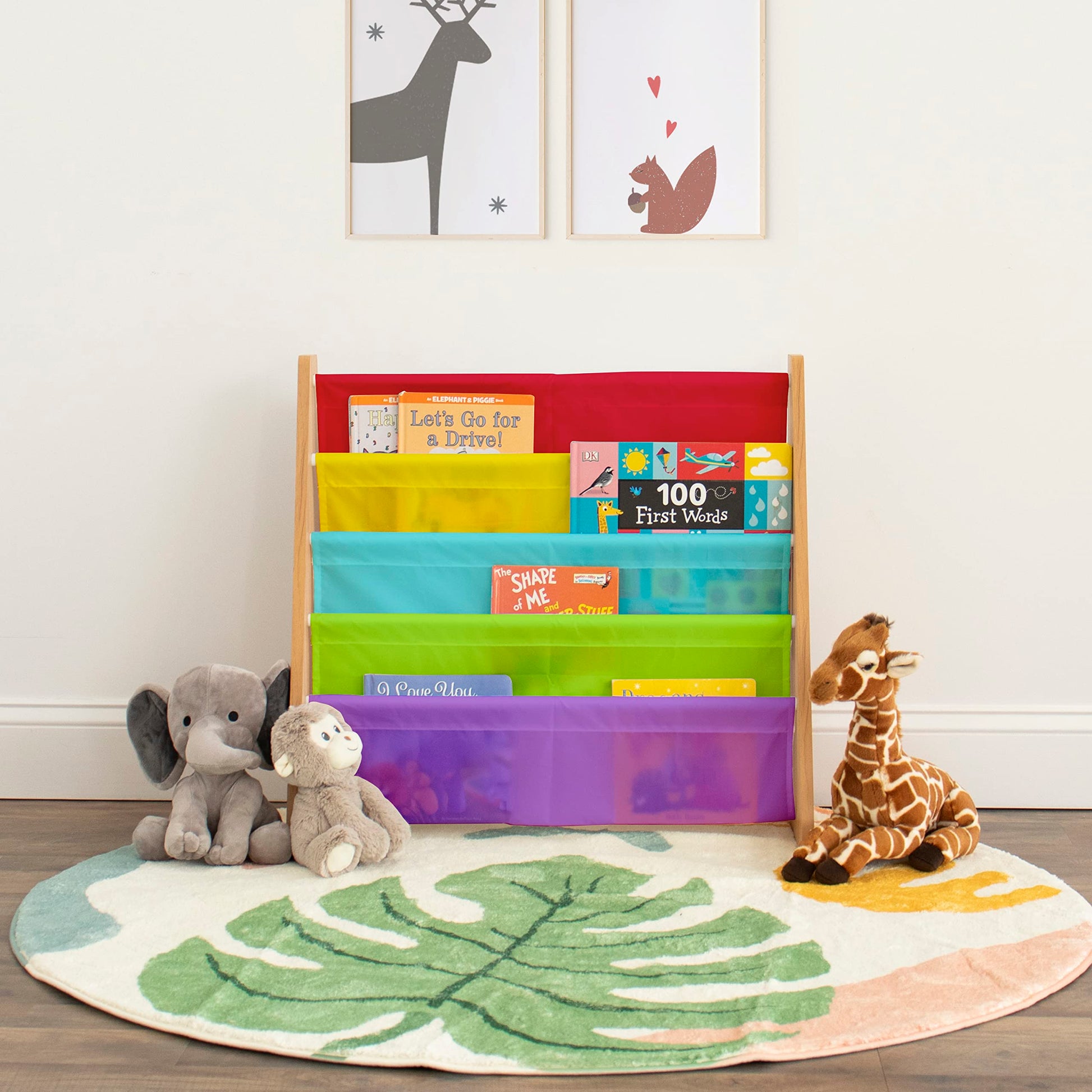 - Durable & Safe Material: Made from natural engineered wood with a sturdy frame and soft rainbow-colored fabric shelves.