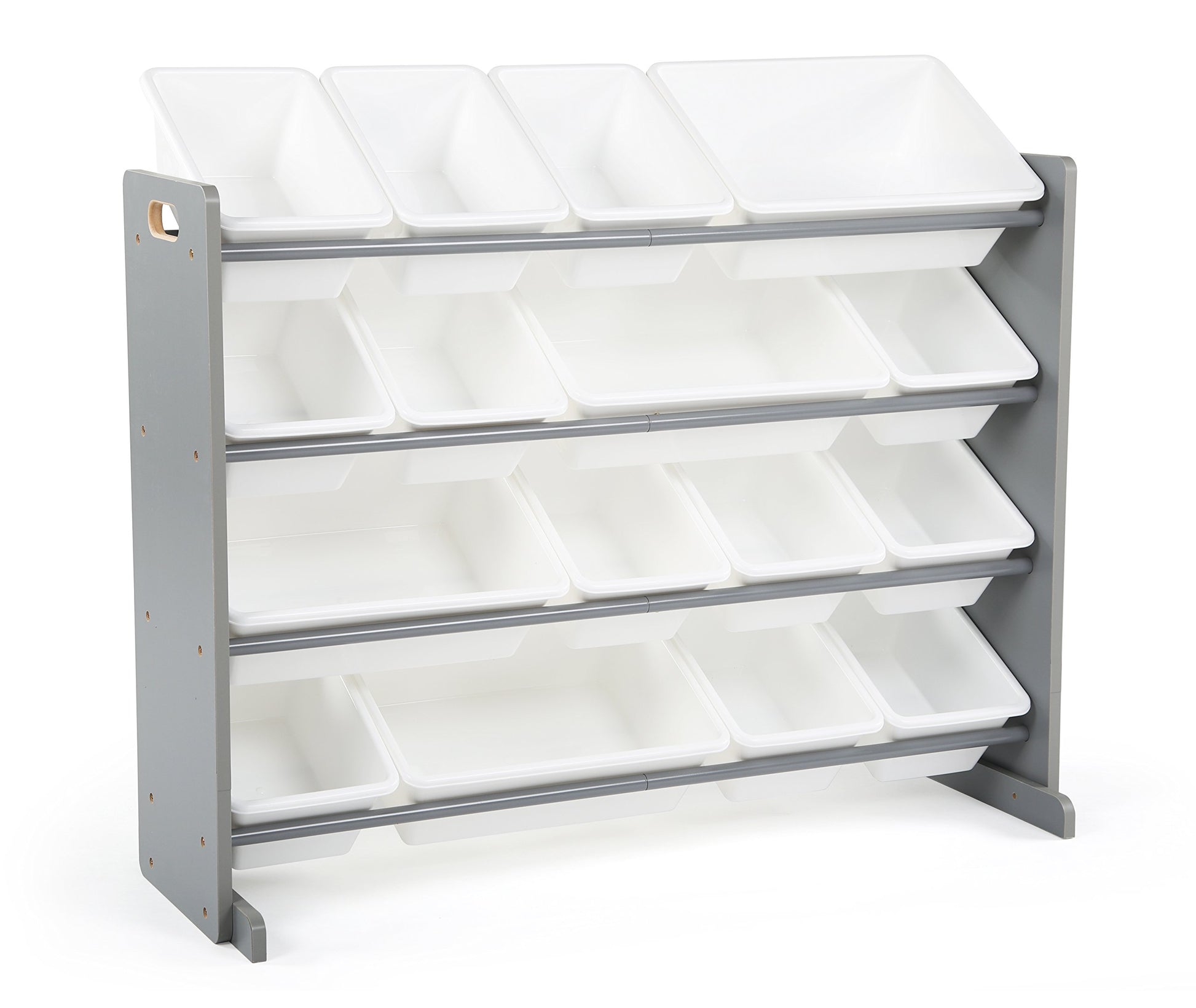 - Includes 12 regular and 4 oversized removable plastic bins for tidy toy storage along with book rack having 4 deep fabric sleeves to hold variety of books
