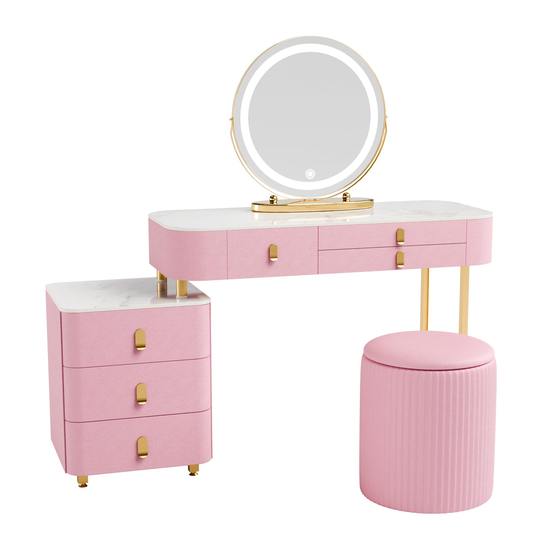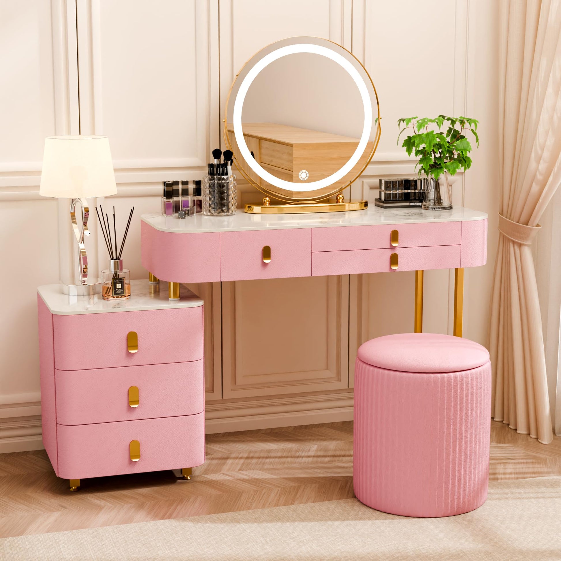Hunlyman Luxury Makeup Vanity-Vanity Desk with 3-Color Adjustable Lights and 6 Solid Wood Drawers,Dressing Table with Side Cabinet Marble Desktop for Modern Bedroom for Her Gift (Pink)