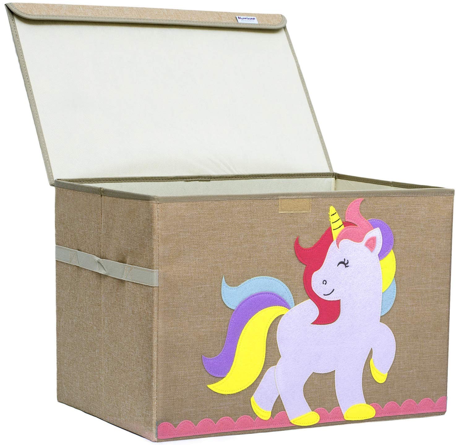 - DESIGN SPECIFICATION: [20.5 inch L x 14 inch W x 15 inch H] Hurricane Munchkin toy chest is constructed with high-quality 100% polyester and thick animal-themed felt applique. Our large foldable toy box features two sturdy handles for easy transport and flip top lid to keep the clutter away.
