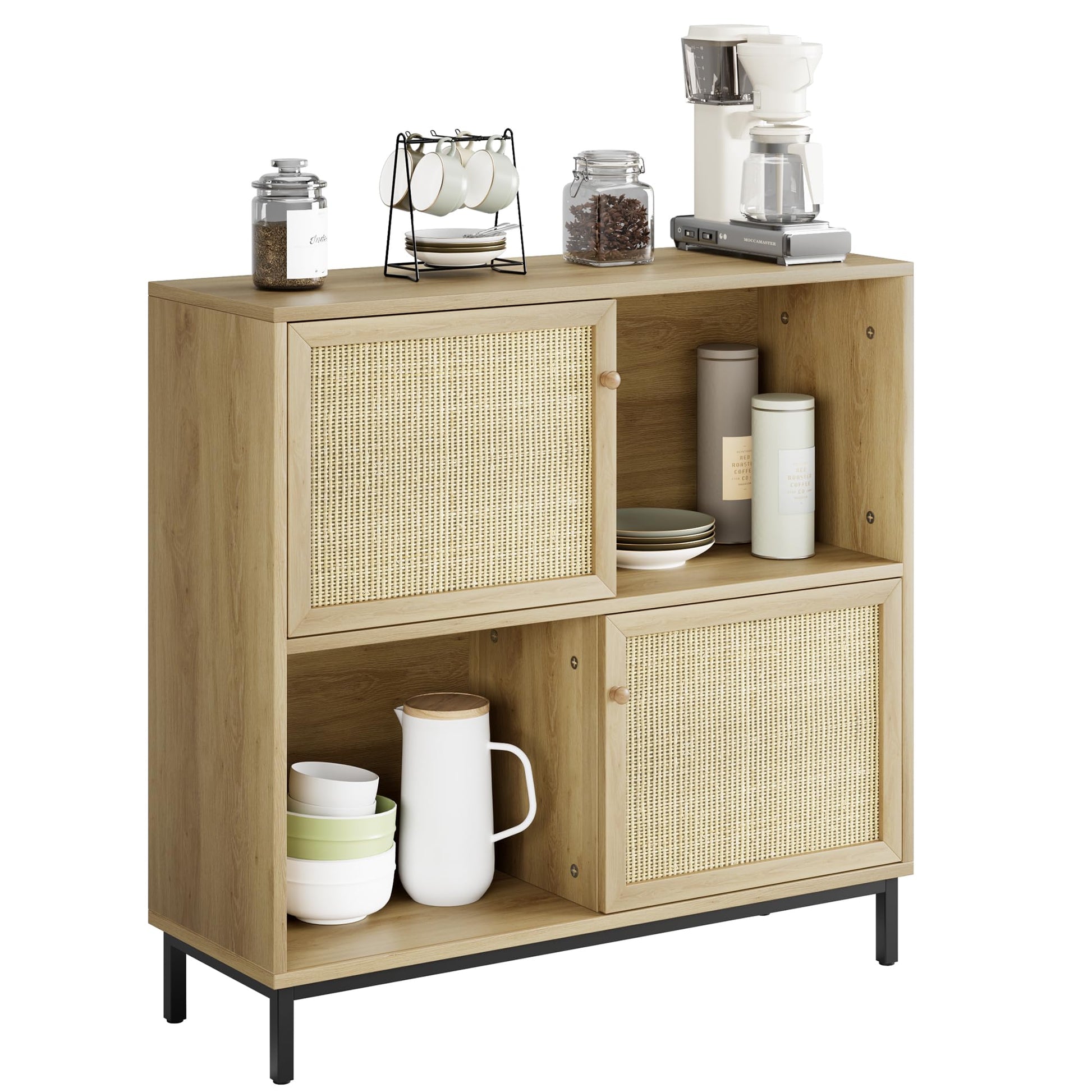 - Rattan Sideboard: Combining a wood-colored cabinet with natural handmade rattan sliding doors, this unique piece emanates a rustic charm that adds an air of elegance to your home. It blends seamlessly with various home decor styles, showcasing a carefully planned layout that maximizes space efficiency. The transformation of storage into an artful display makes this sideboard visually stunning and highly practical.