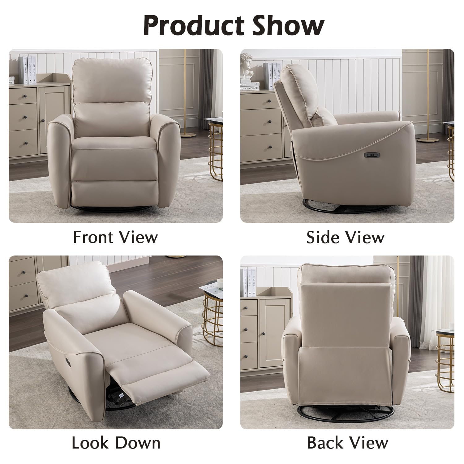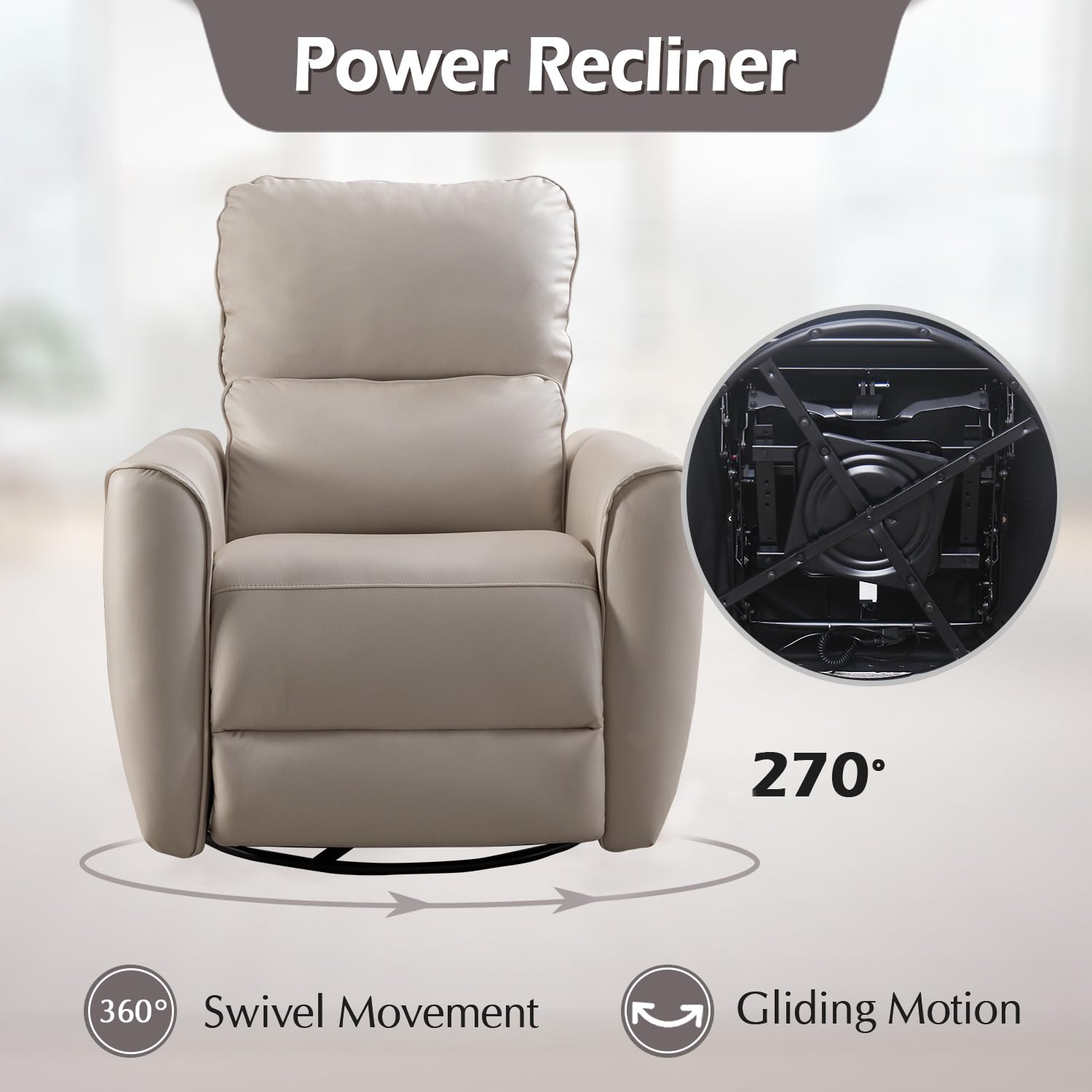 - Power Recliner and Swivel Glider This recliner offers the convenience of power reclining, allowing you to easily adjust the seating position at the touch of a button. The swivel glider feature enables smooth rotation and gentle rocking motions, enhancing relaxation and versatility.