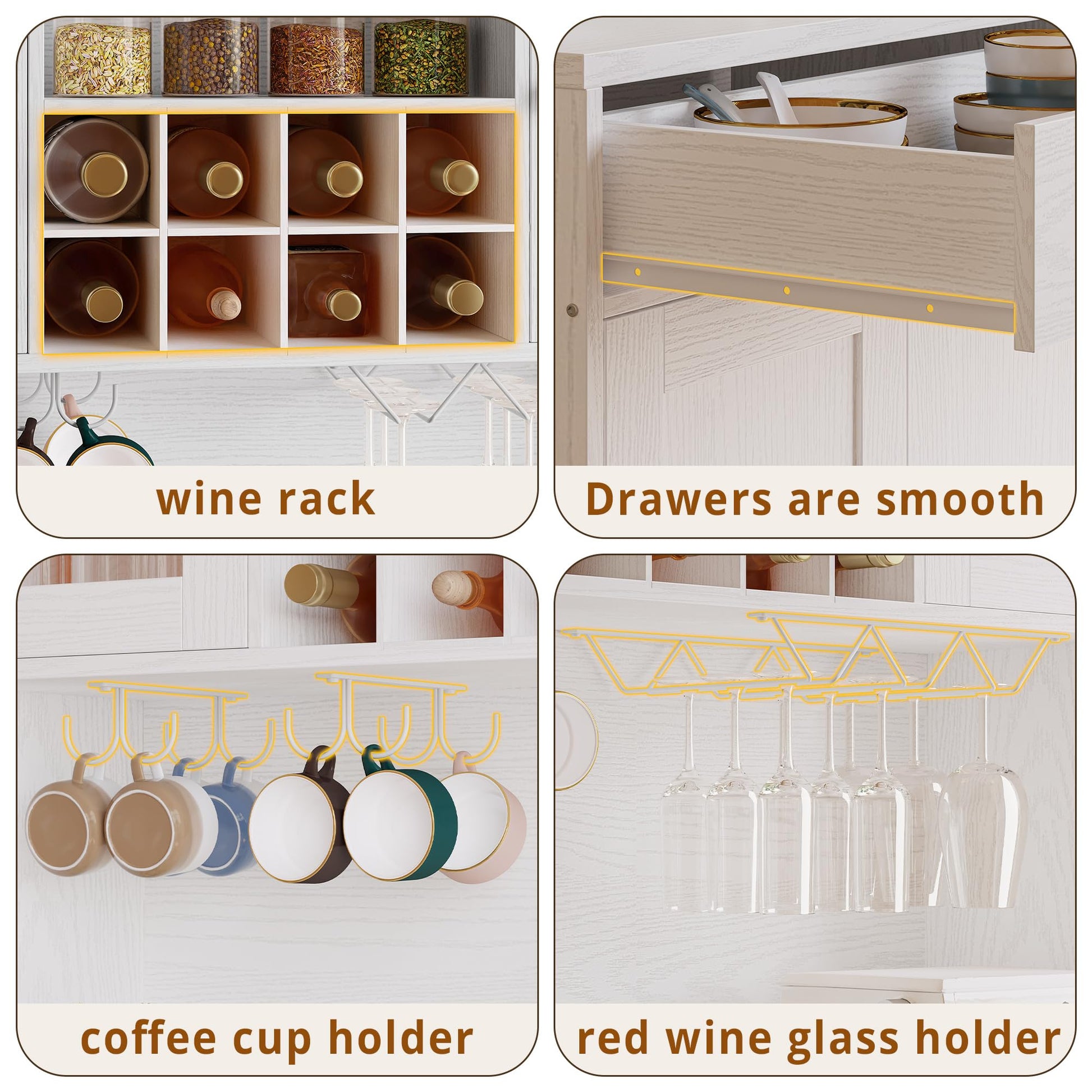 - Generous Storage Space: Spacious countertop can accommodate effortlessly microwave and coffee maker, toasters, while 4 doors cabinets, 2 drawers, 1 wine rack, and wine/cup hooks make dust-free yet classified storage from tableware, snacks to kitchen appliances possible.