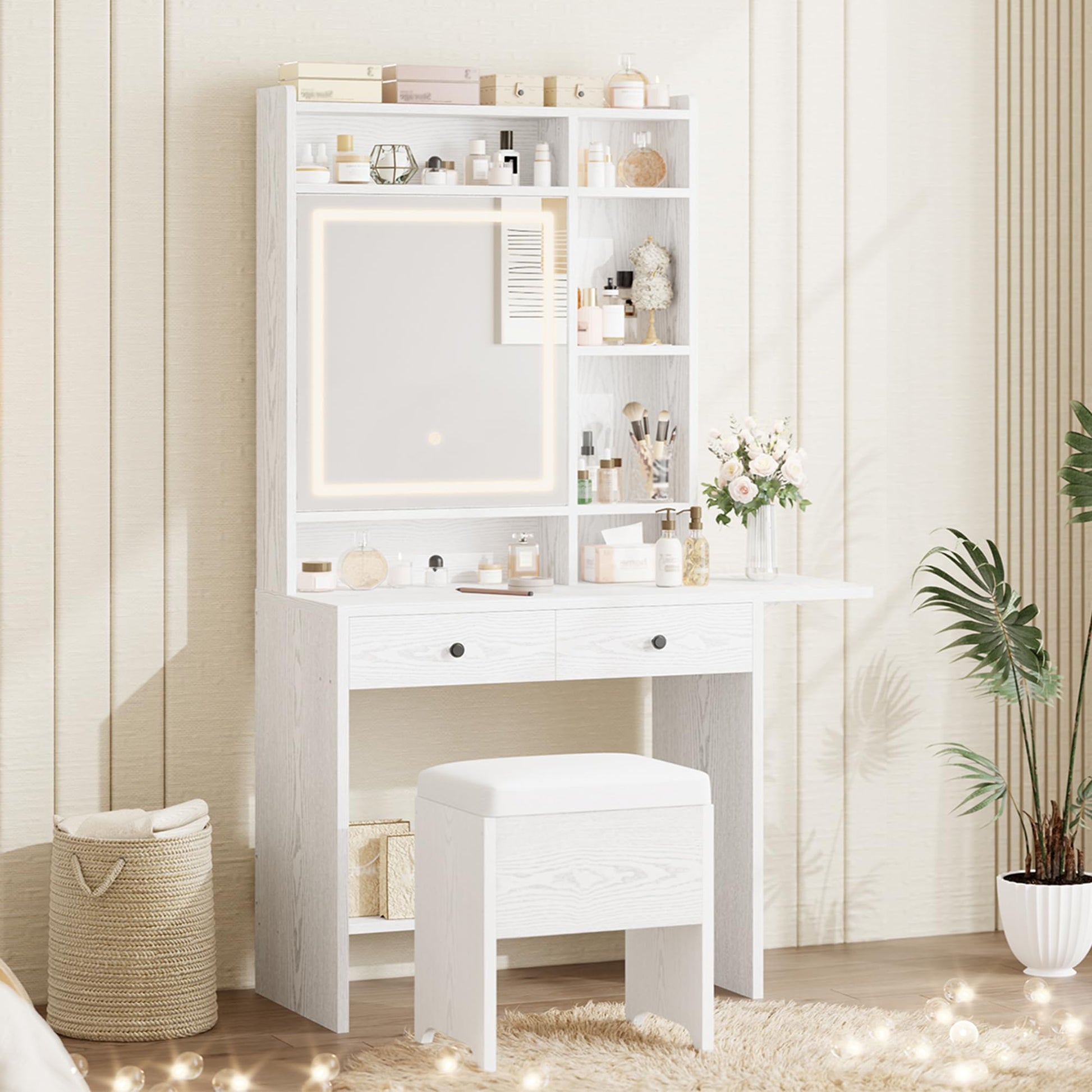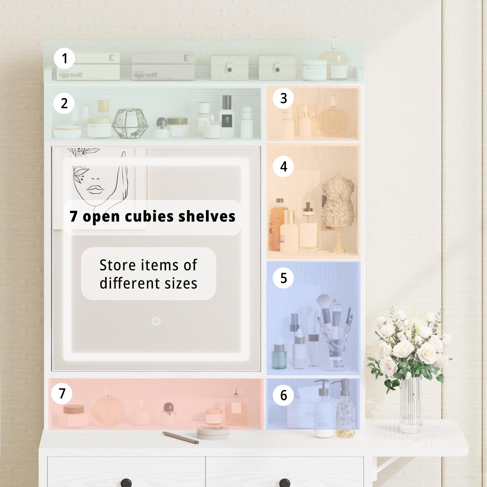 - Ample Storage Space: With 6 open shelves, 2 drawers, and storage areas on the top and bottom of the desktop, this Vanity Desk provides ample space to keep all your belongings organized