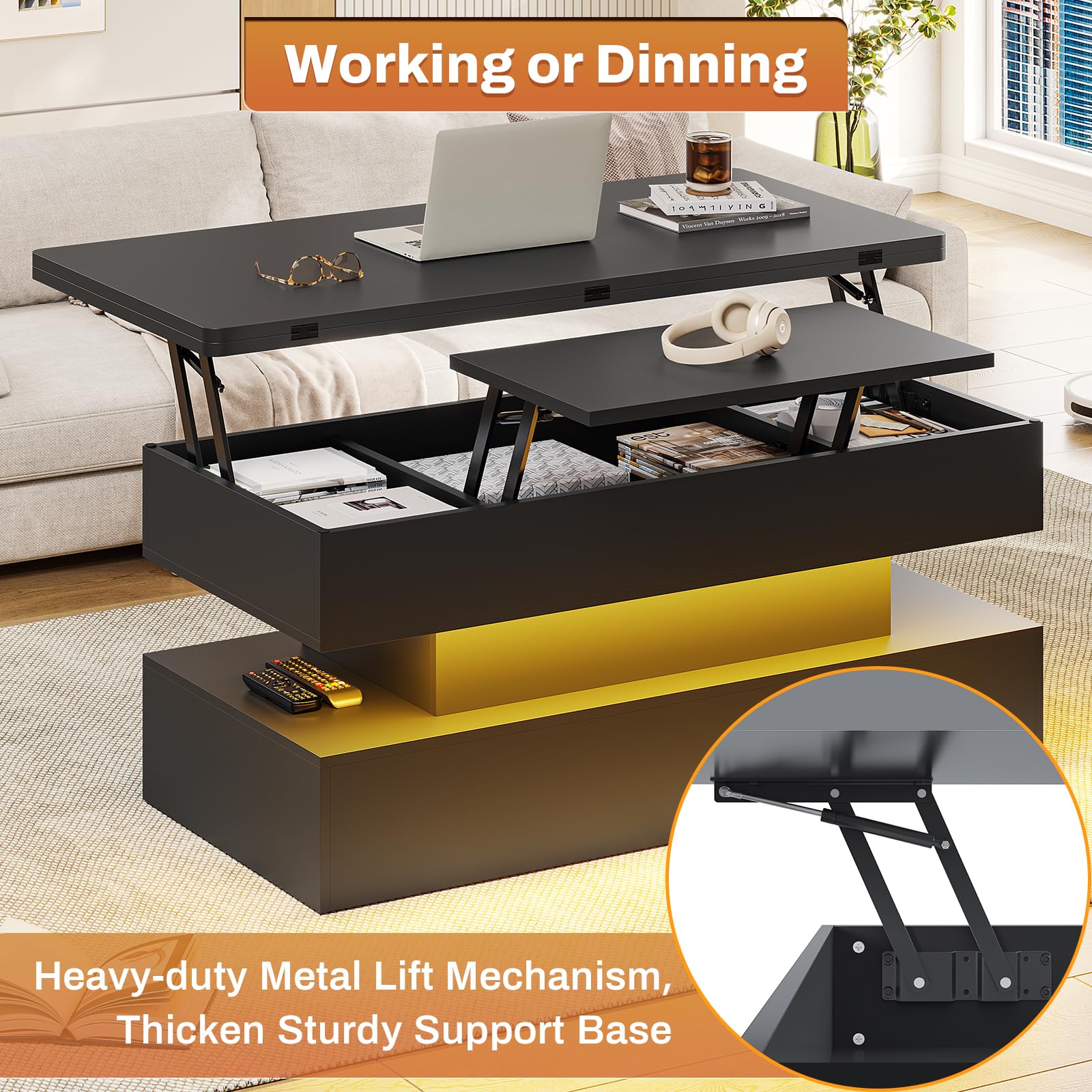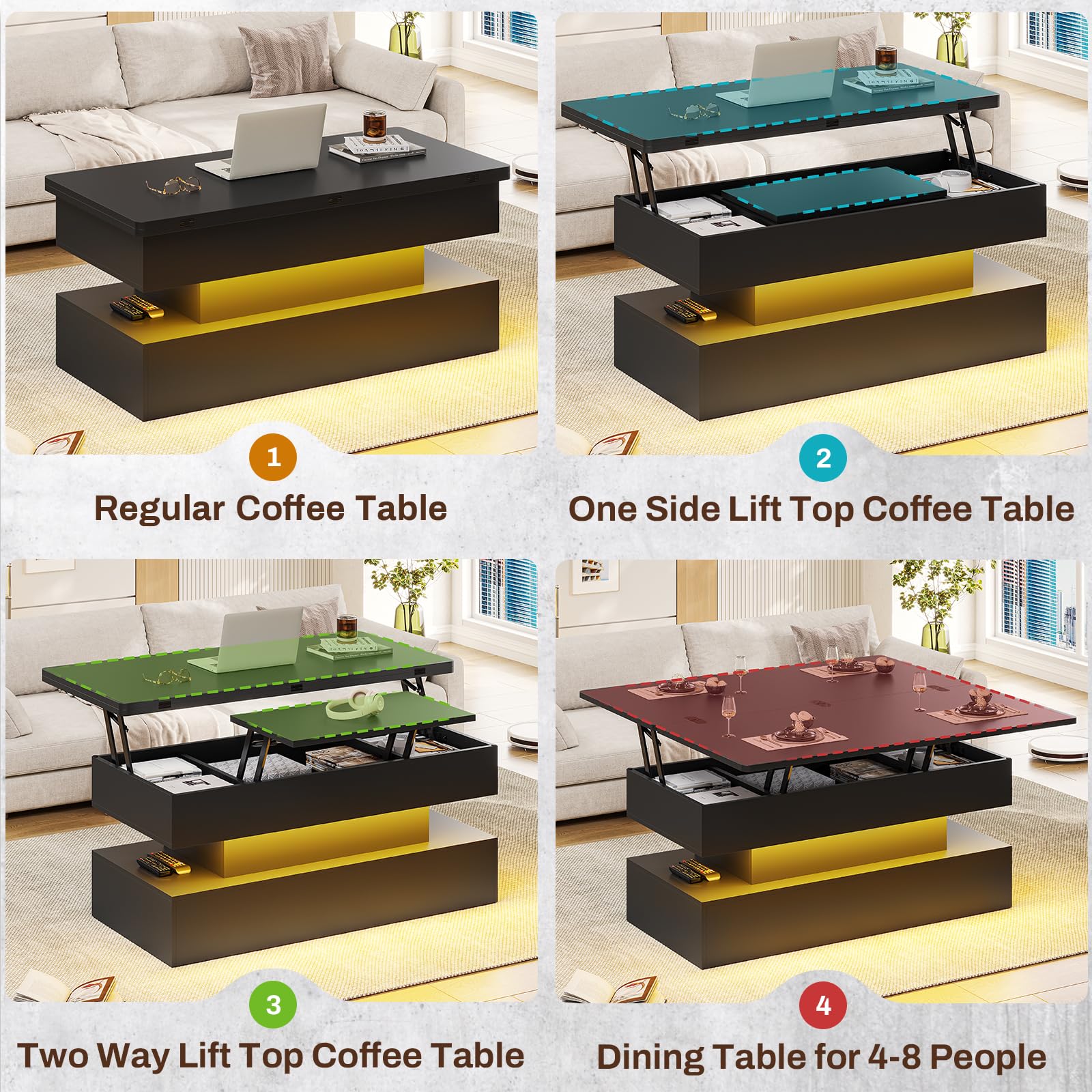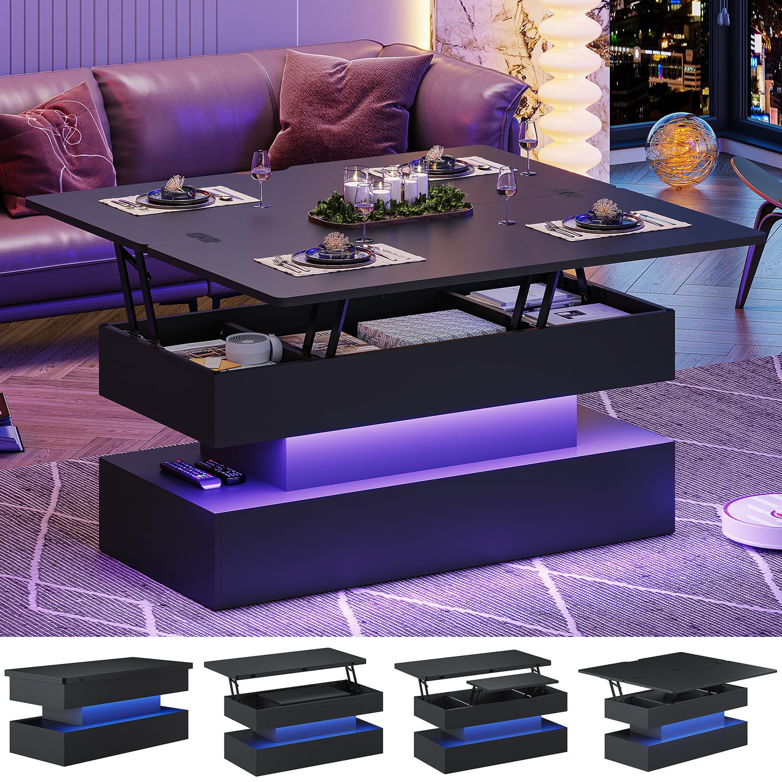 - Versatile Lift Top Coffee Table This stylish coffee table has 4 lifting methods and is also equipped with partitioned hidden storage compartments, open storage shelves, and LED lighting. This contemporary coffee tables features a lift-off top that can be used while eating, working, studying or playing games, making it the perfect addition to small or limited spaces. (Note: The lower table must be raised first to avoid damage.)