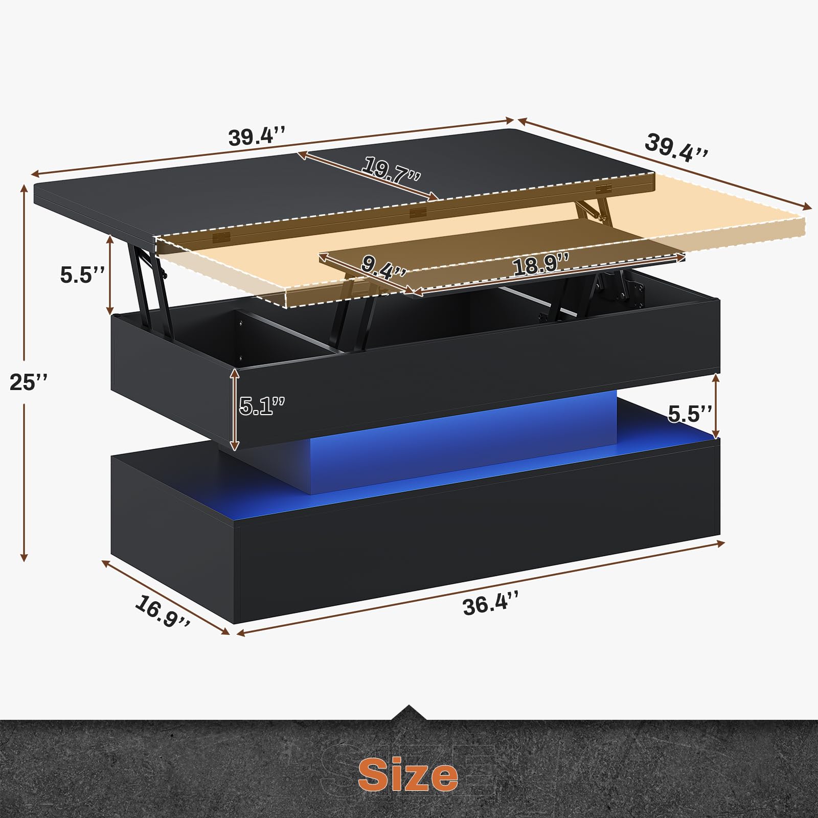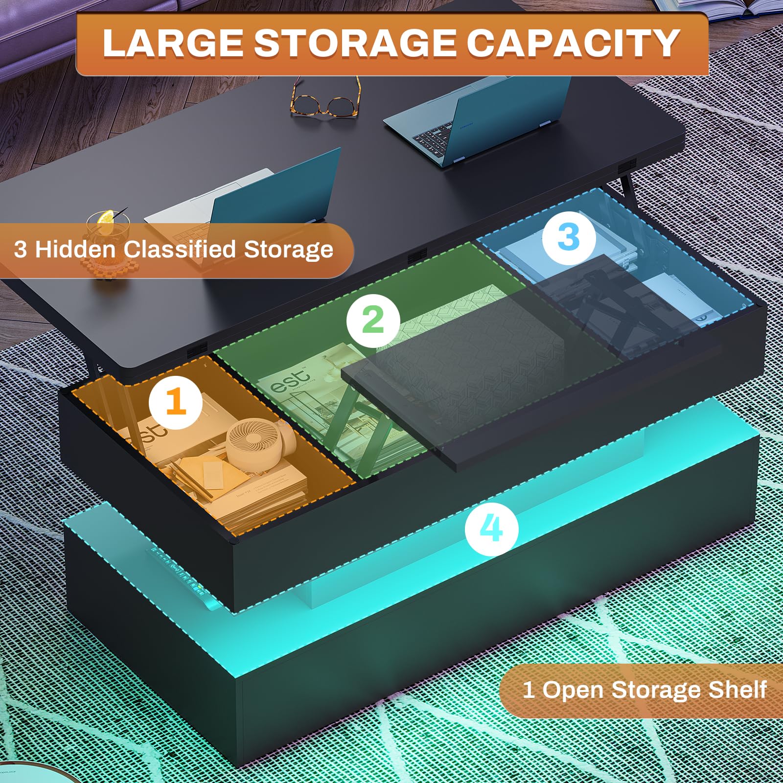 40" Lift Top Coffee Table, 4 in 1 Coffee Table with Storage & LED Light