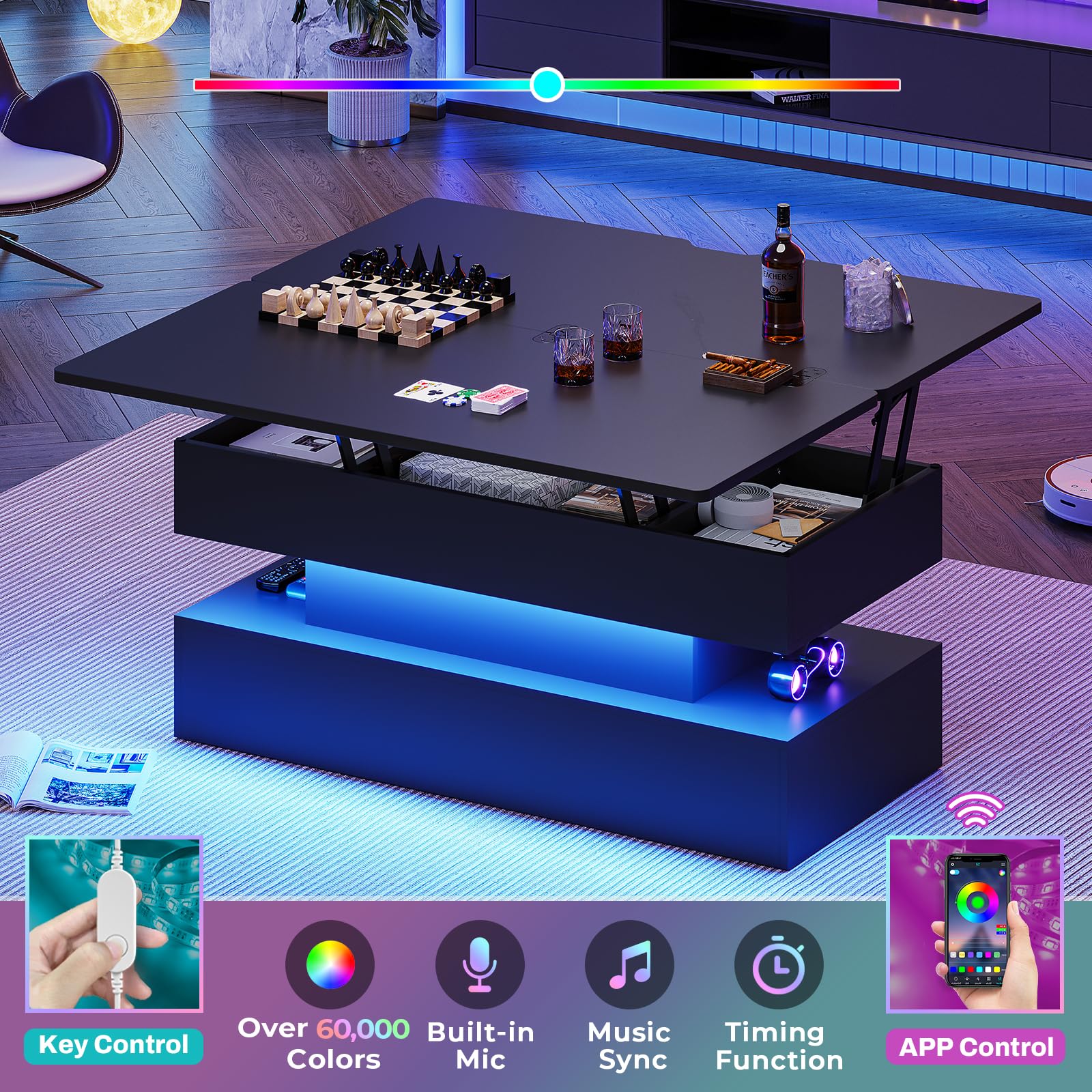 - Quality Upgrade The high-quality metal gas support mechanism is superior to traditional compression springs, making the table easy to lift and lower without noise. Ensure the coffee table with storage remains stable under greater pressure and can support up to 166 lbs. This coffee table features an RGB LED strip that can be controlled remotely via the APP and features multiple colors and 29 flash modes. You can adjust the lighting to suit your mood at any time, making it a stylish addition to any living room.