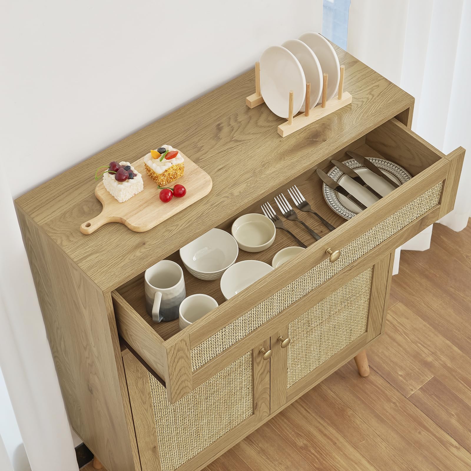 Iwell Storage Cabinet with Adjustable Shelf, Rattan Cabinet with Large Drawer, Sideboard Bufffet Cabient with Storage, Bathroom Storage Cabinet, Accent Cabinet for Entryway, Natural