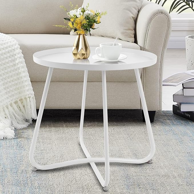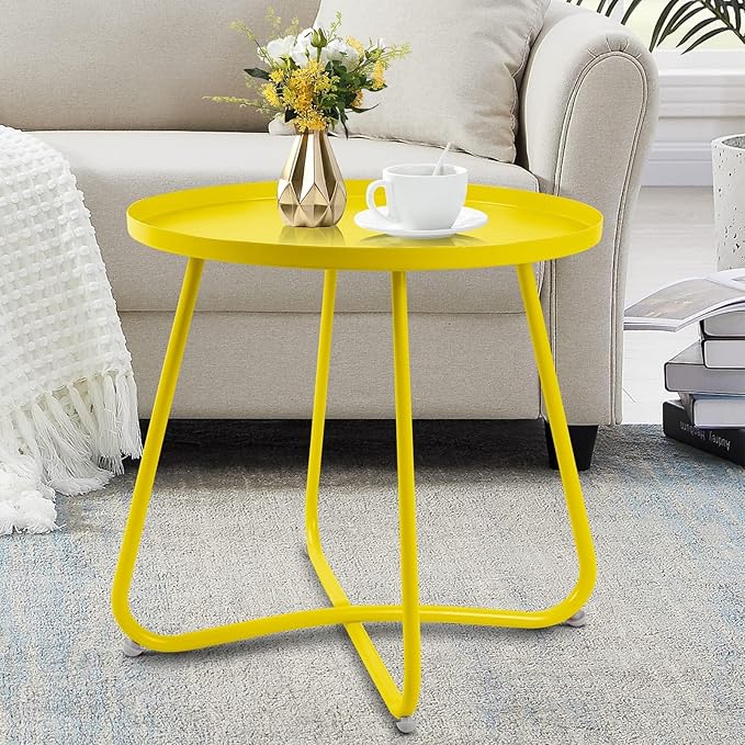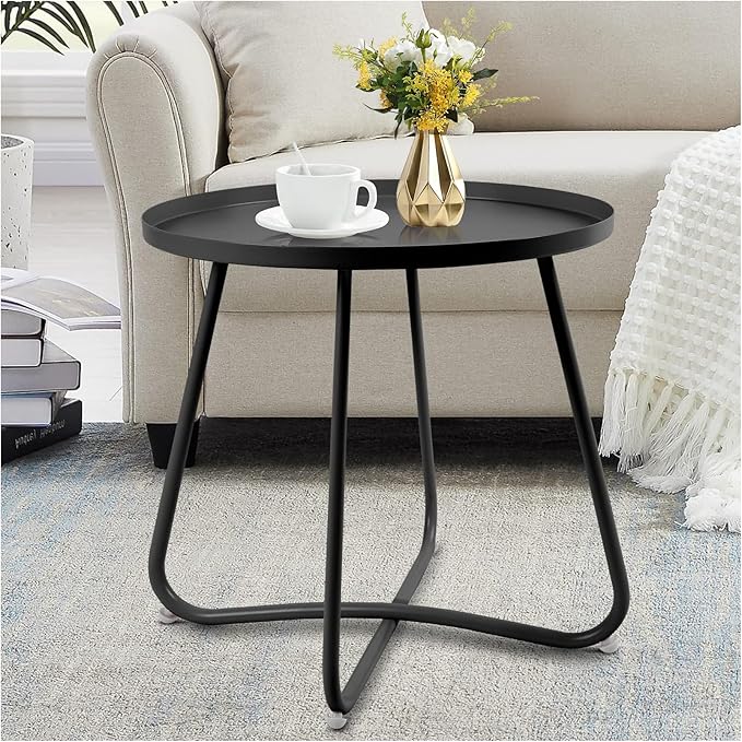 - This new version steel patio side table with unique edge curl design prevents items from falling out. Can be placed in your living room as a side table, sofa table, coffee table, phone table, the patio table weighs only 6 lbs, light and portable. You can use it indoors or outdoors as needed.