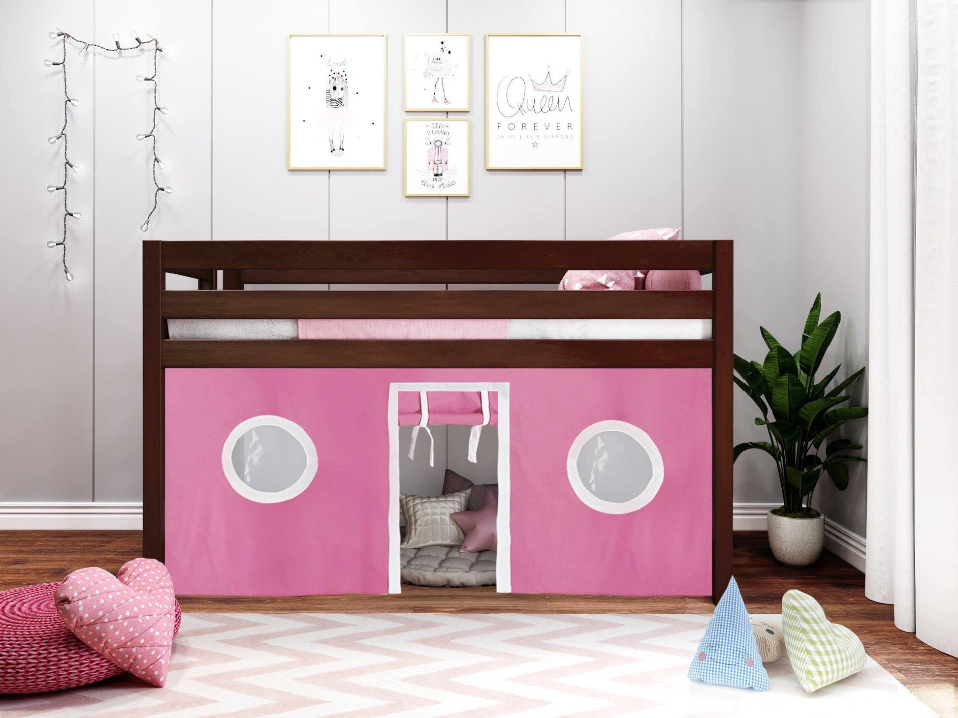 - JACKPOT Contemporary Low Loft Twin Bed with End Ladder in Cherry with a Pink and White Tent