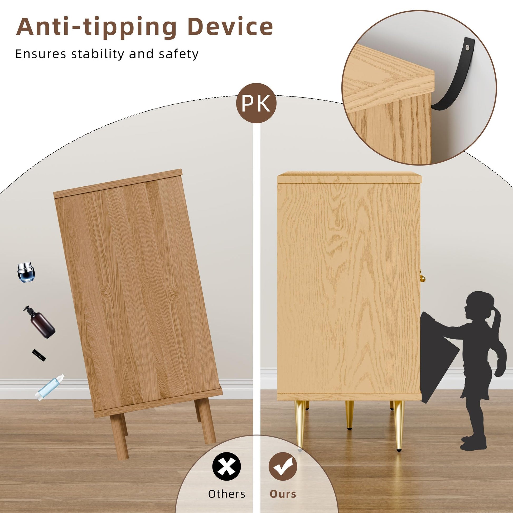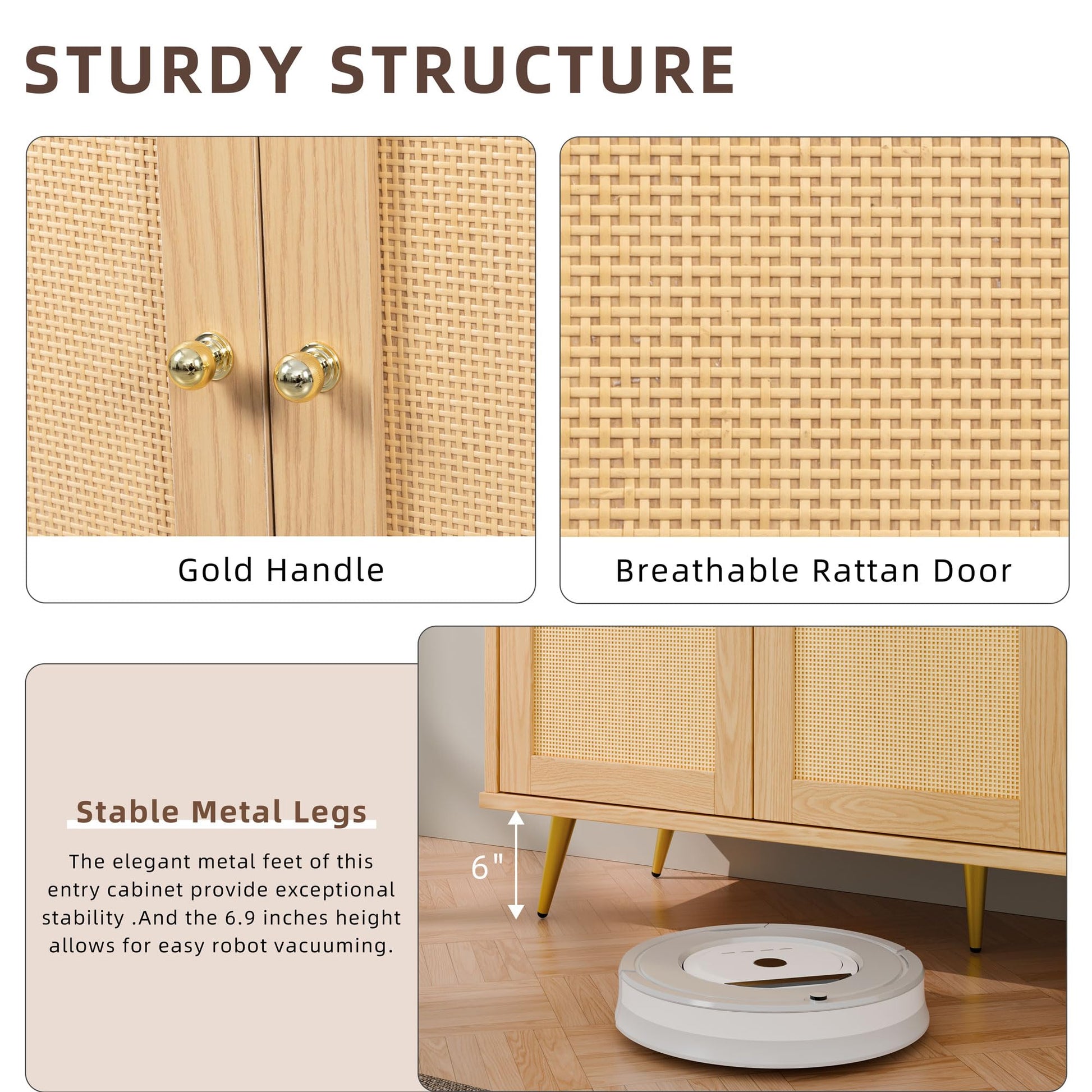 - Safe and Sturdy The rattan accent cabinet is designed with metal handles for easy opening and closing of sideboard cabinet doors and accessing items. High-quality metal Legs make this entryway cabinet more sturdy, which is not afraid of long-term use. Toppling preventing devices ensure safety when using the shoe storage cabinet, while making the practical shoe cabinet and the wall fit better.
